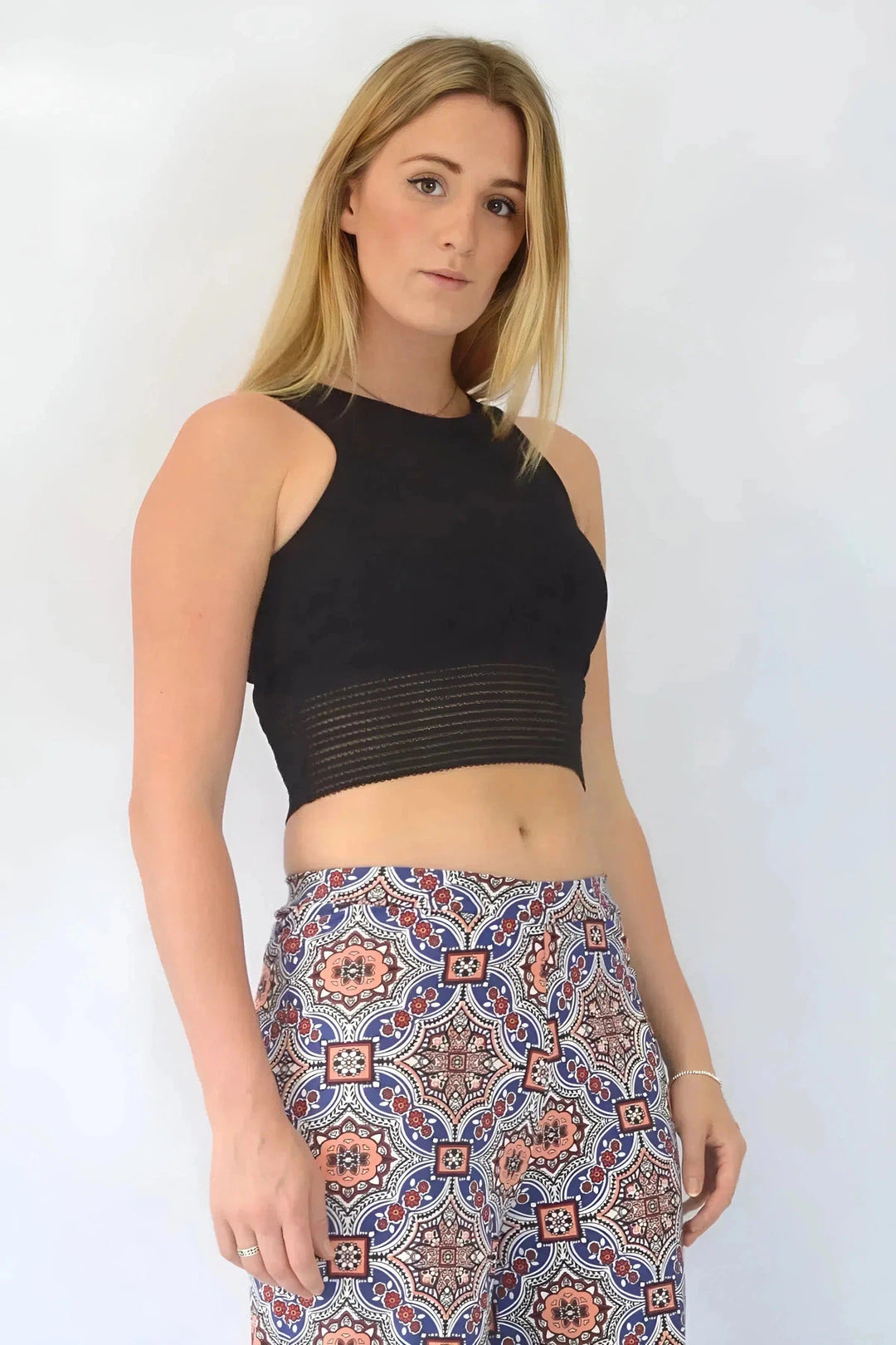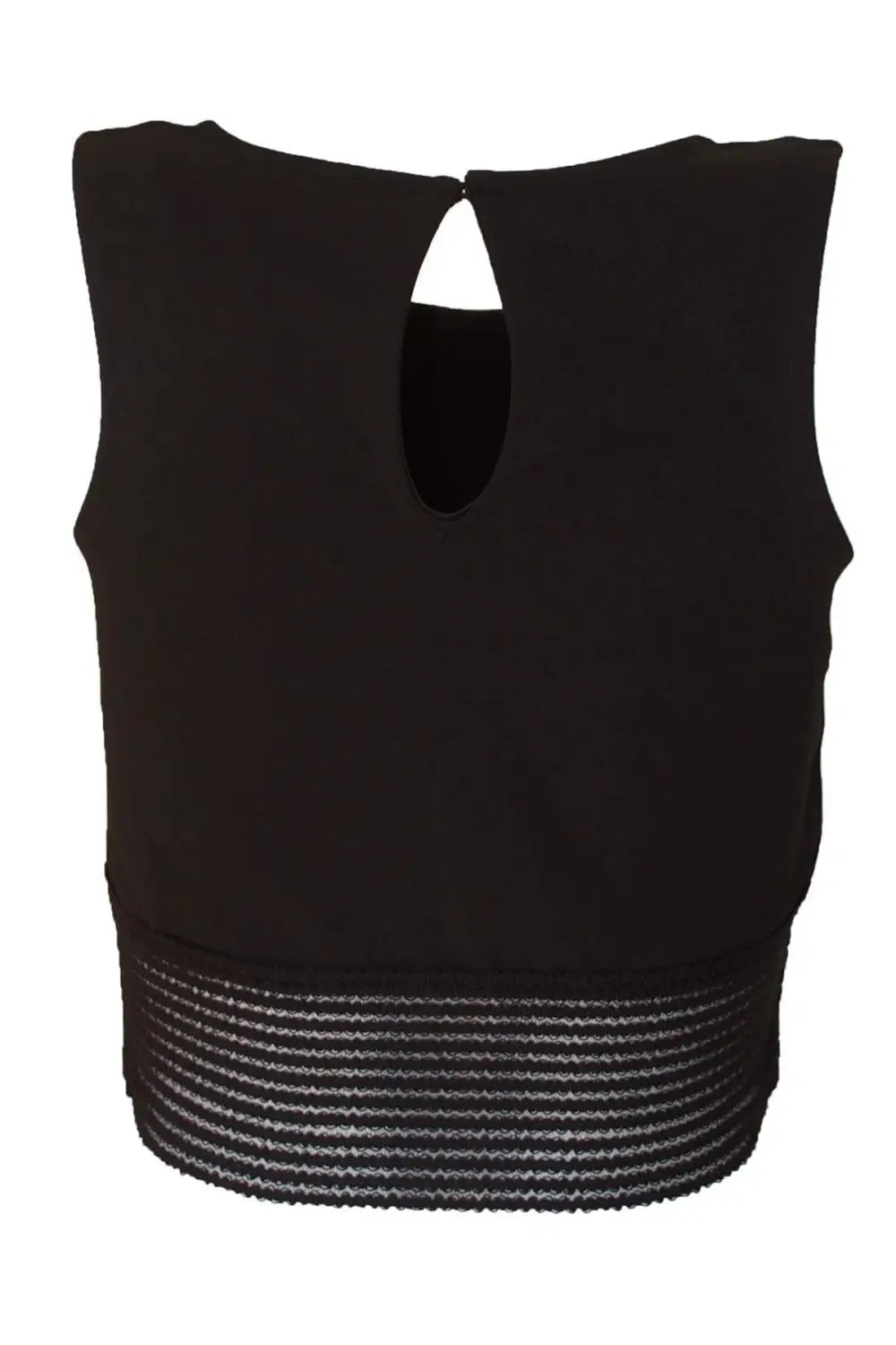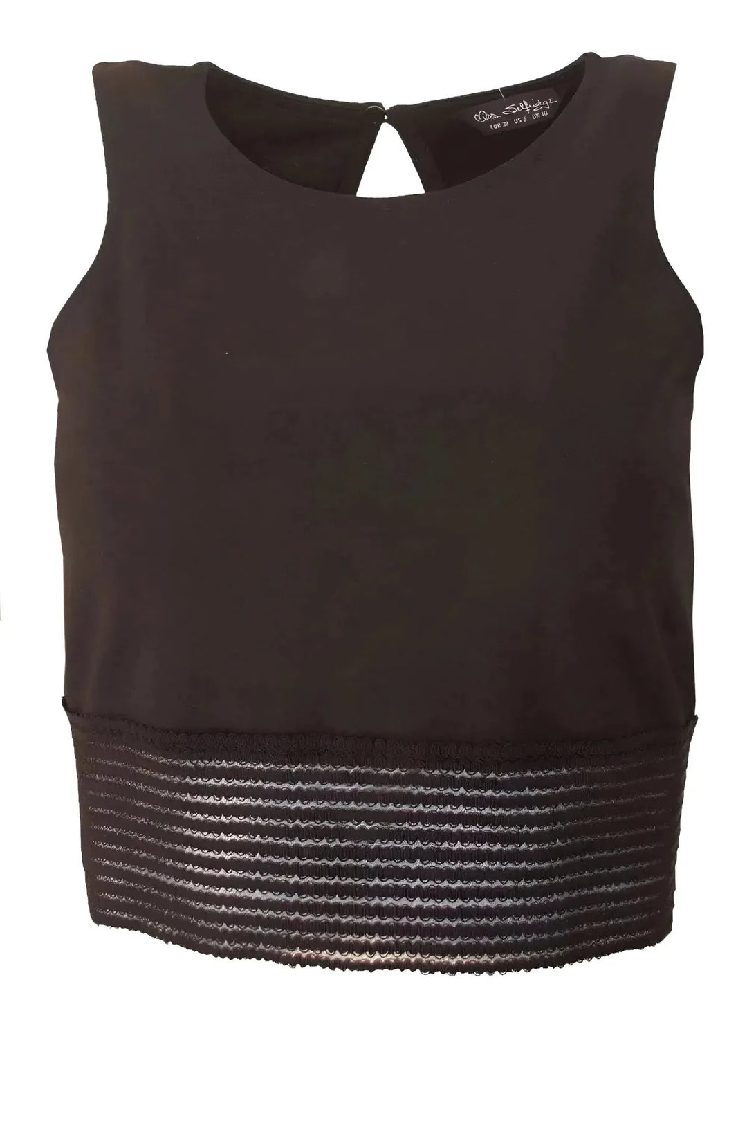Pretty Black Sleeveless Box Top with Inset Lace Panel, Scoop Neckline, Pretty Lace Hem, Sleeveless with button fastening at back neck.