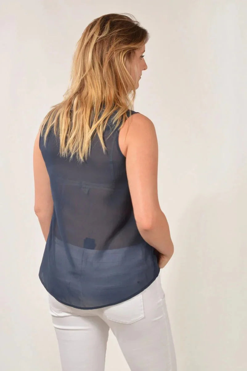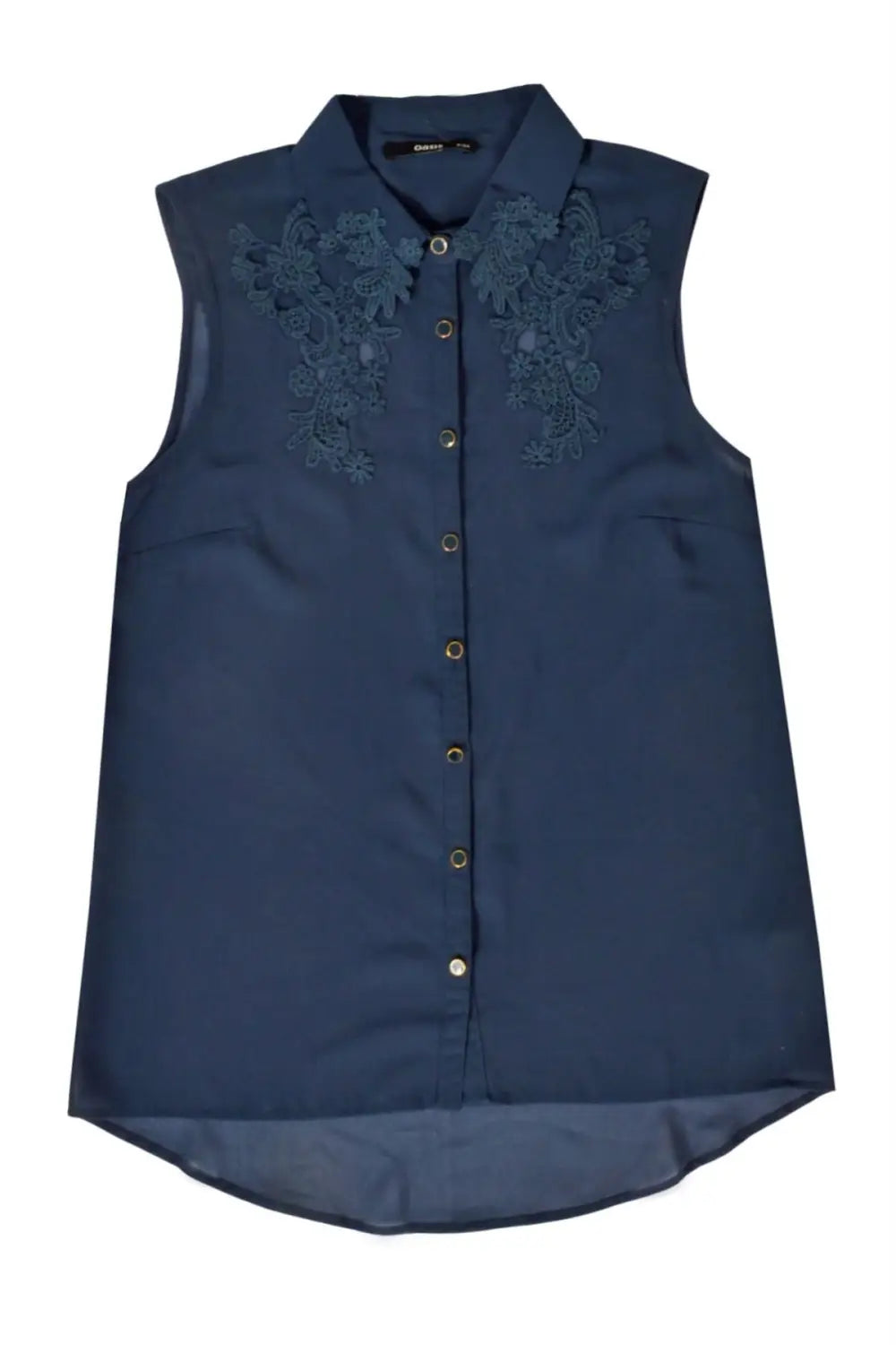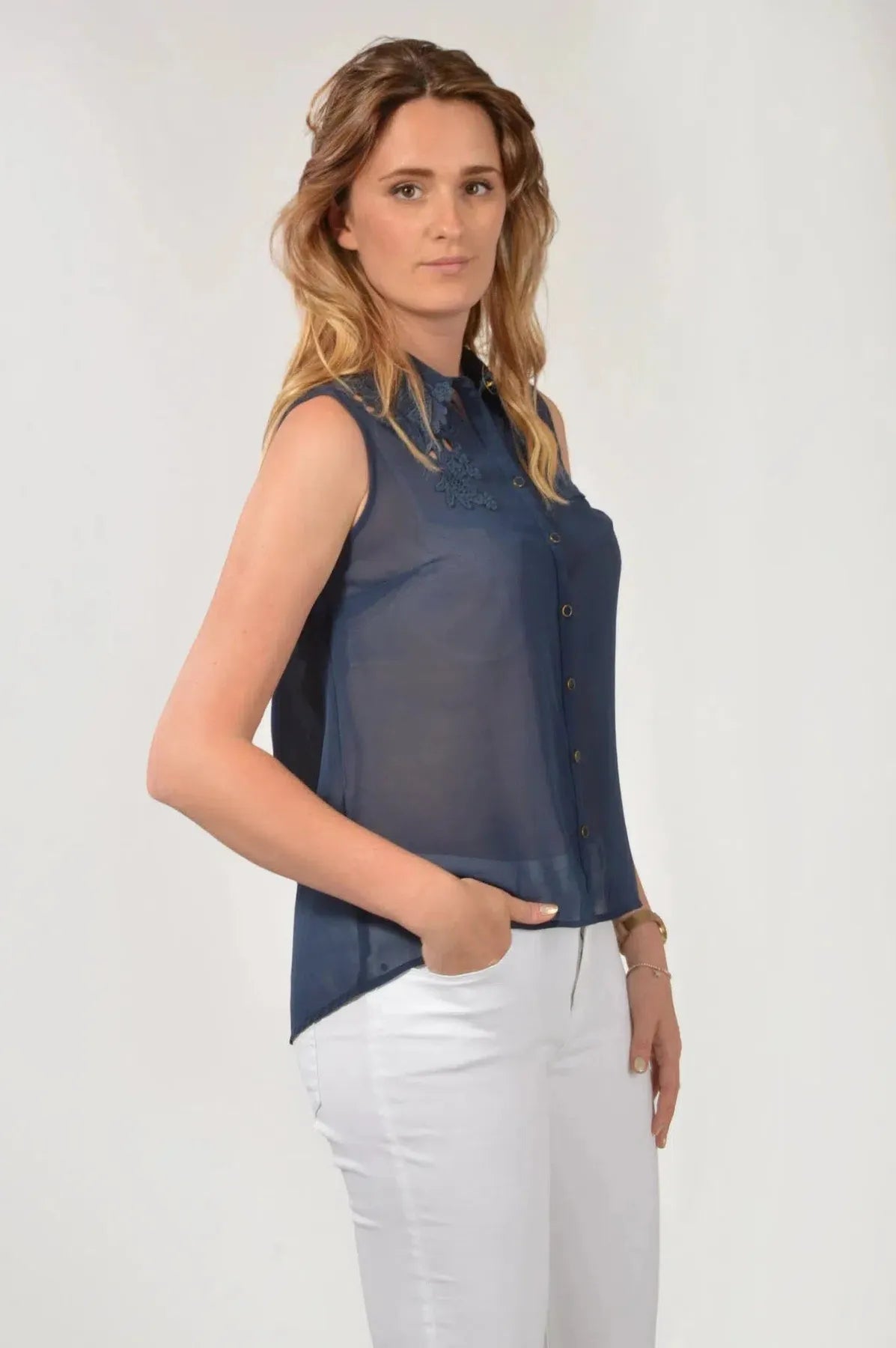 Delicate sleeveless, loose Summer blouse. With a button-down front, this smart top is finished with a lace detail collar and burnt-out lace finish. Wear over a plain cami top for work or formal occasions. The longer length curved hem can be left to hang loose for a more relaxed look.