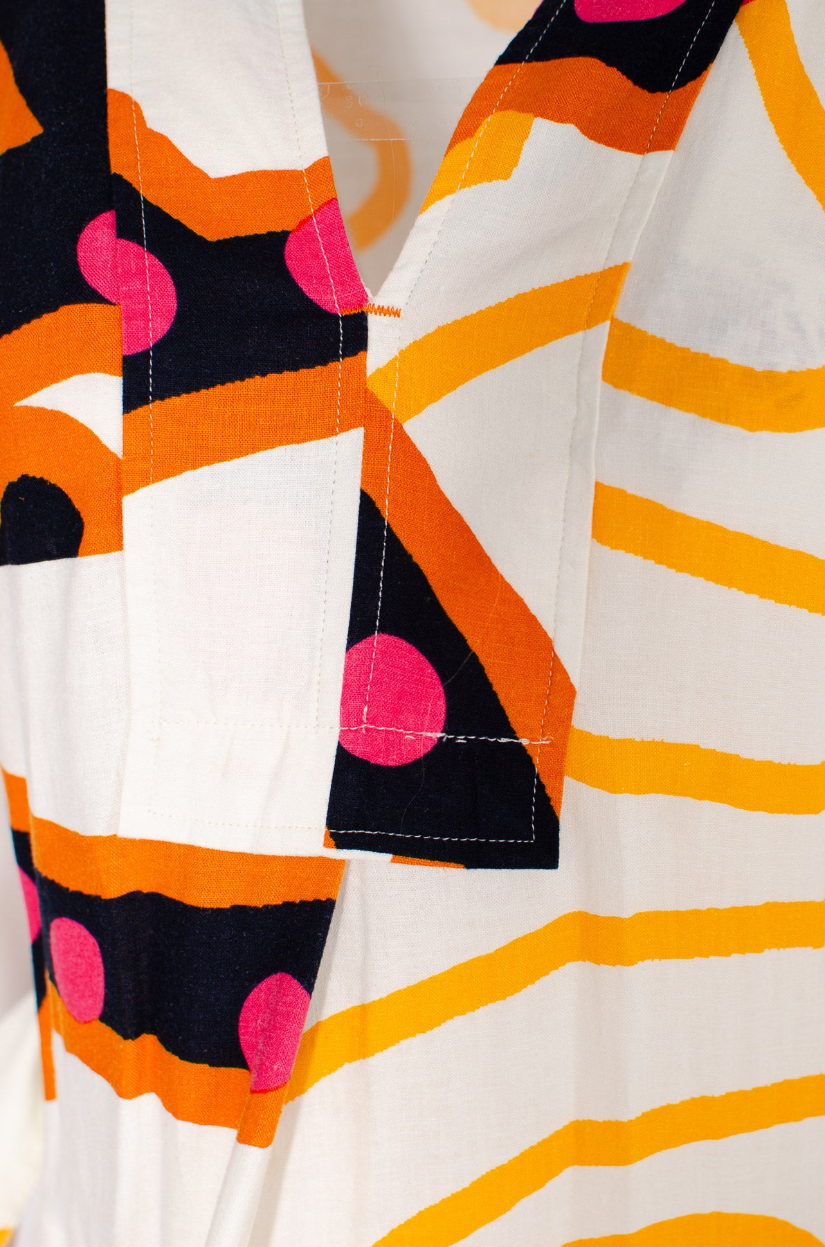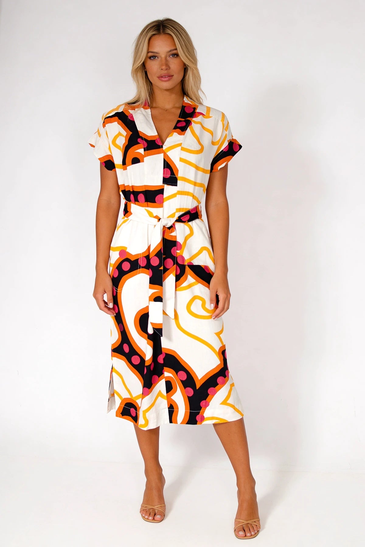 This vibrant print summer dress will brighten up any day. Made from a cool linen blended with cotton, featuring a placket and pleat front with V neckline. Finished with short turn up sleeves. Wear with fabric tie belt or loose - images show both.