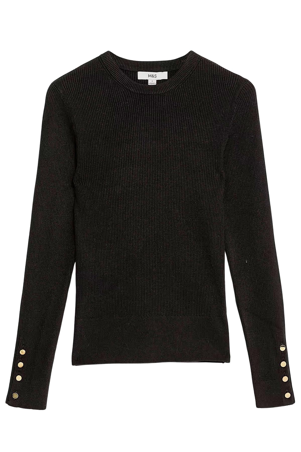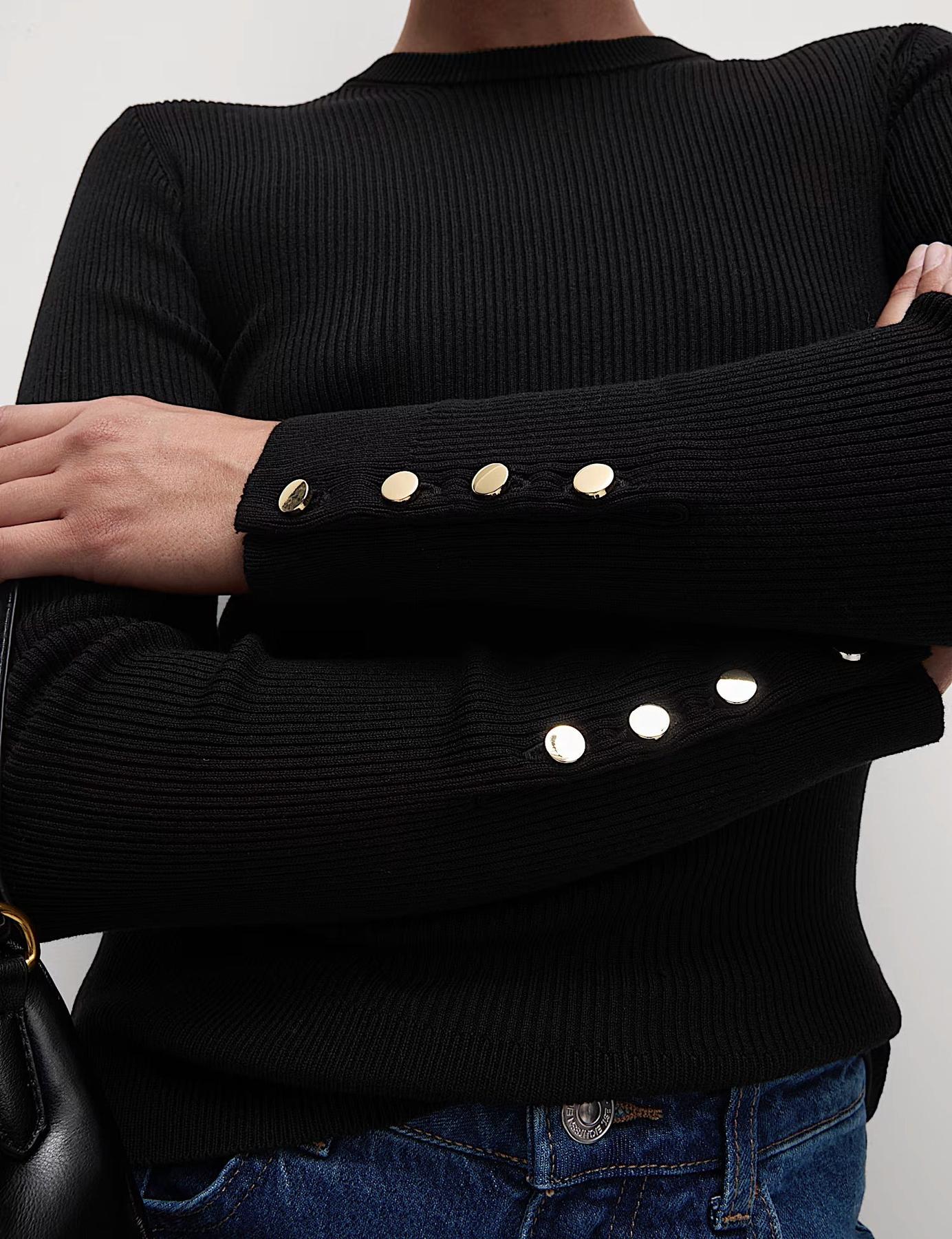 This ribbed round neck jumper is perfect for everyday wear, combining comfort and style effortlessly. The soft knit offers a cozy fit, while the button detail on the sleeves adds a stylish, statement touch.