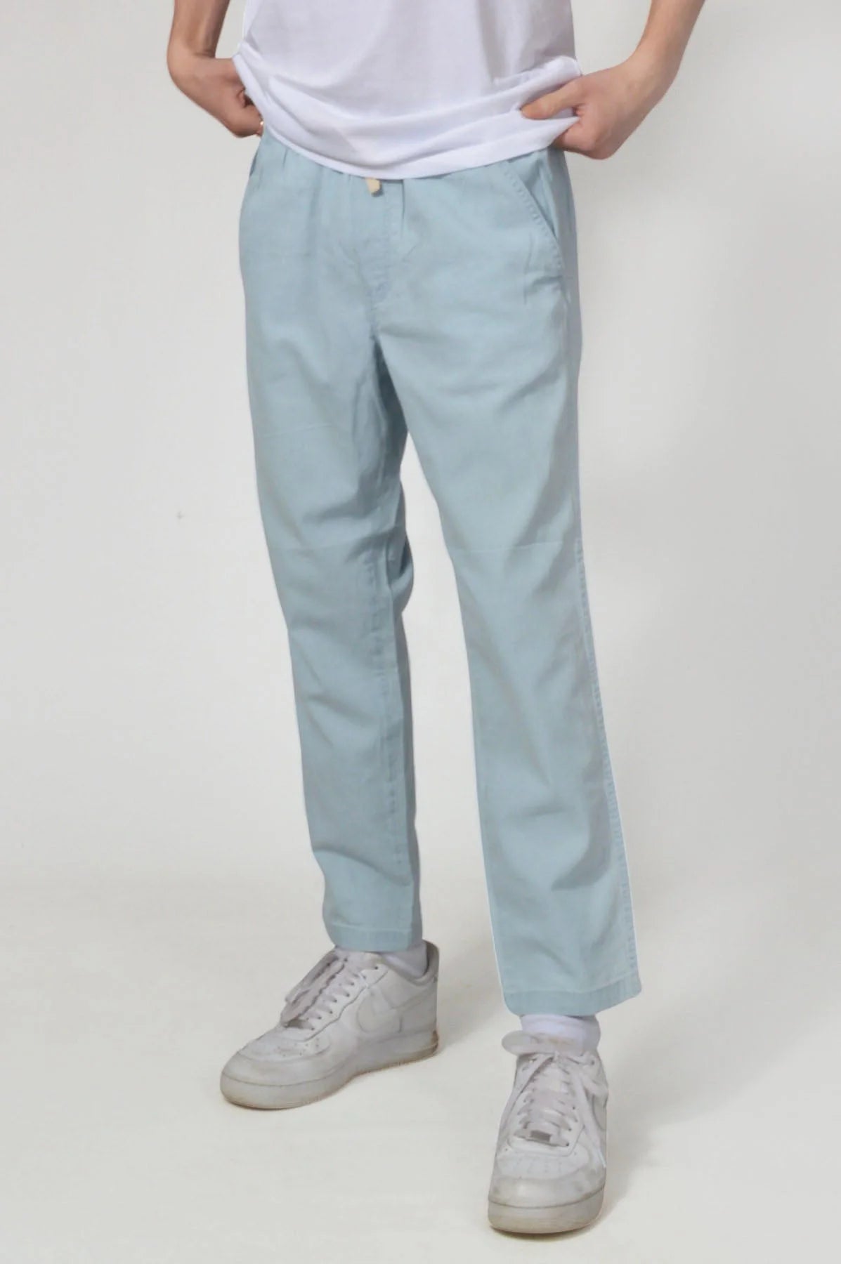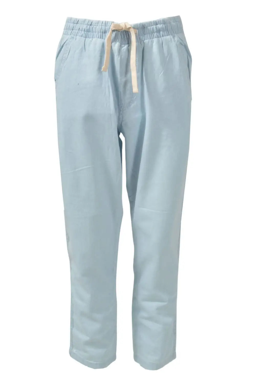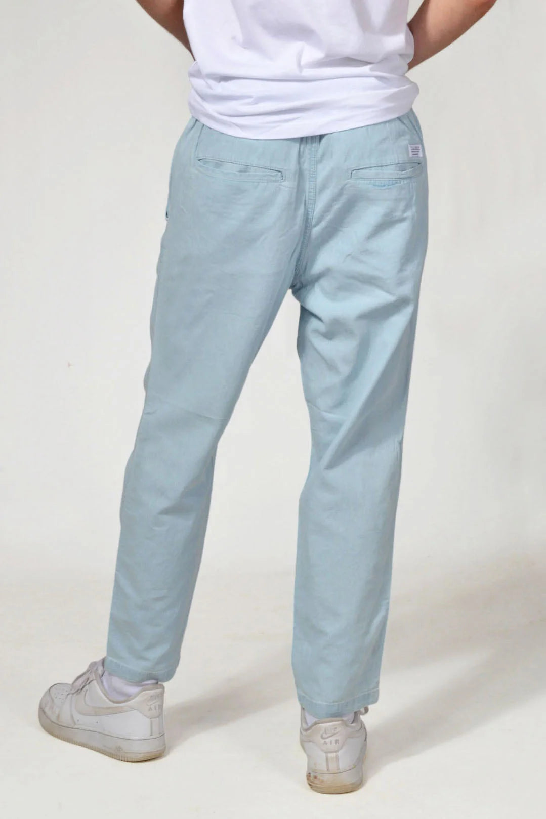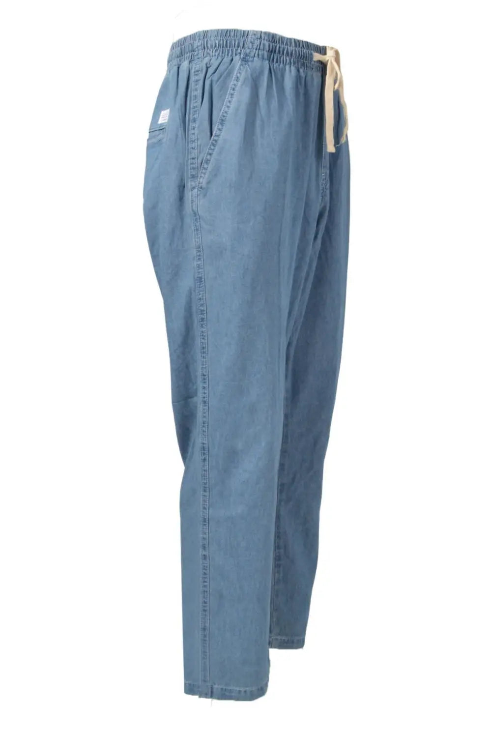Joggers in lightweight cotton denim. Elasticated waist with a drawstring, mock fly, side pockets and discreet back pocket. Straight/taper legs with good room for movement over the thighs and knees