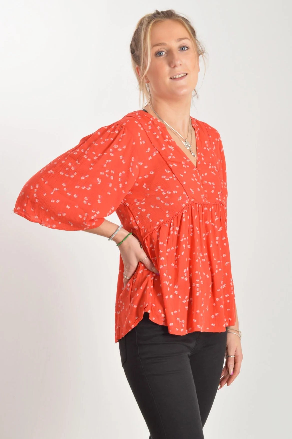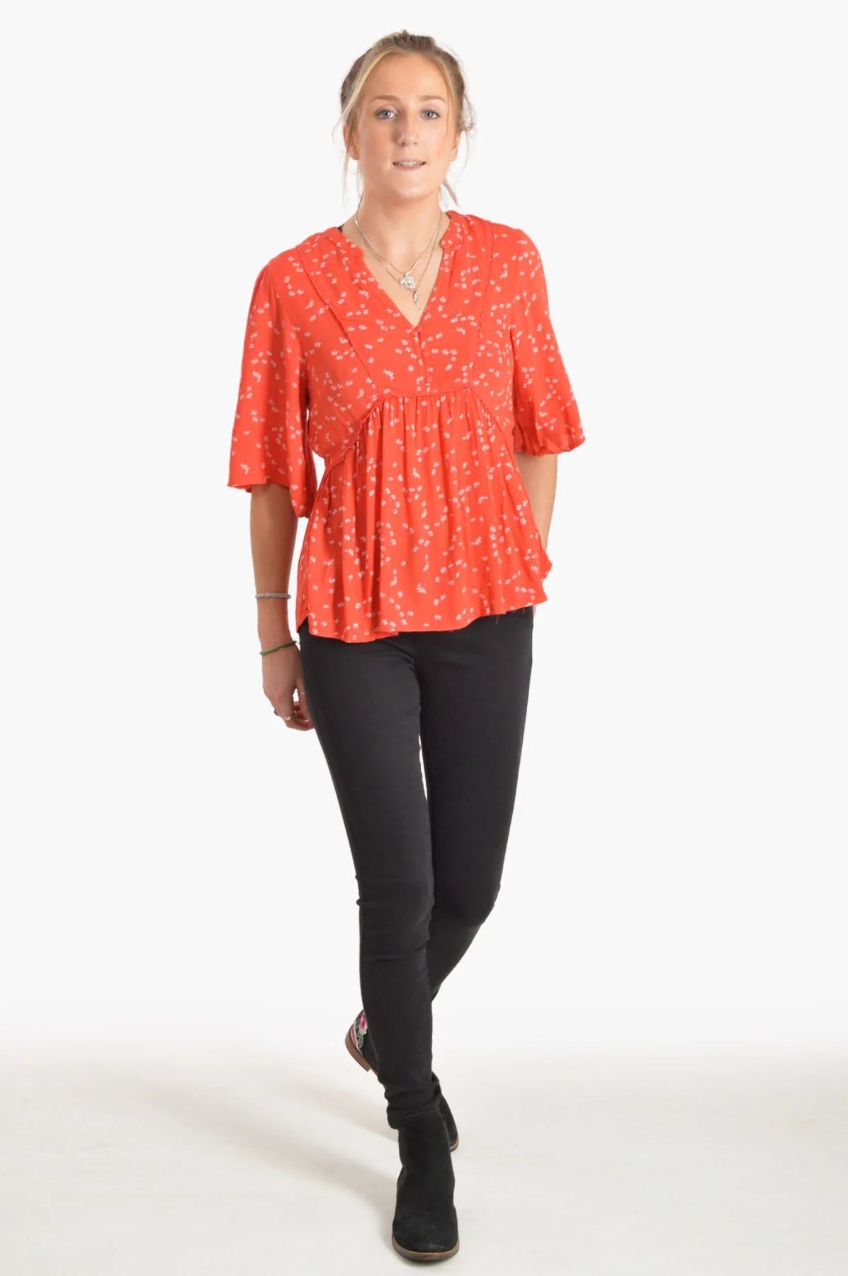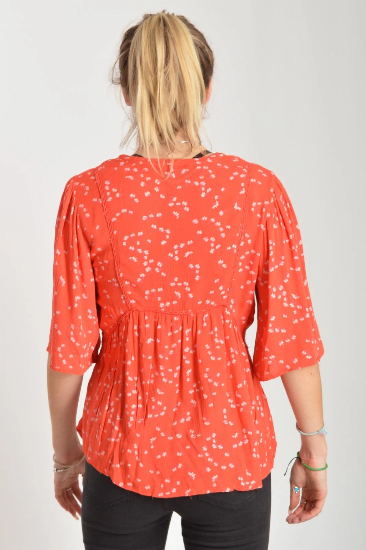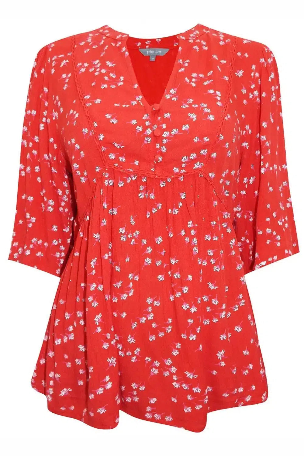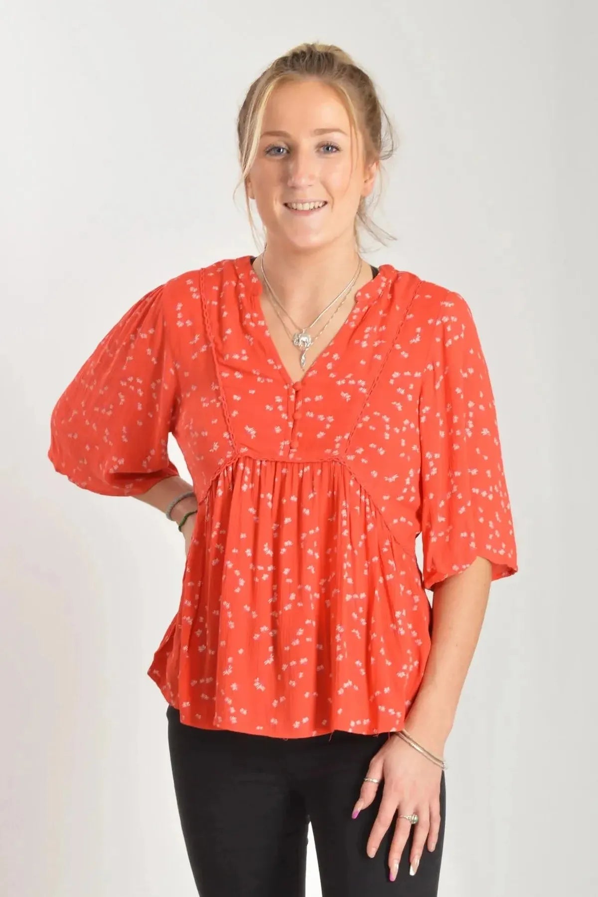This pretty tunic blouse works for just about every occasion. Looks great with jeans for a casual look, and equally good with smart trousers, try with a flared trouser for style and comfort. With V Neckline and covered buttons to a high waist with cotton lace trim. The wide flowing sleeves drape to sit on the elbow.