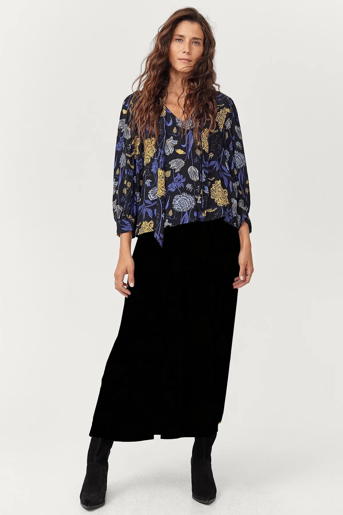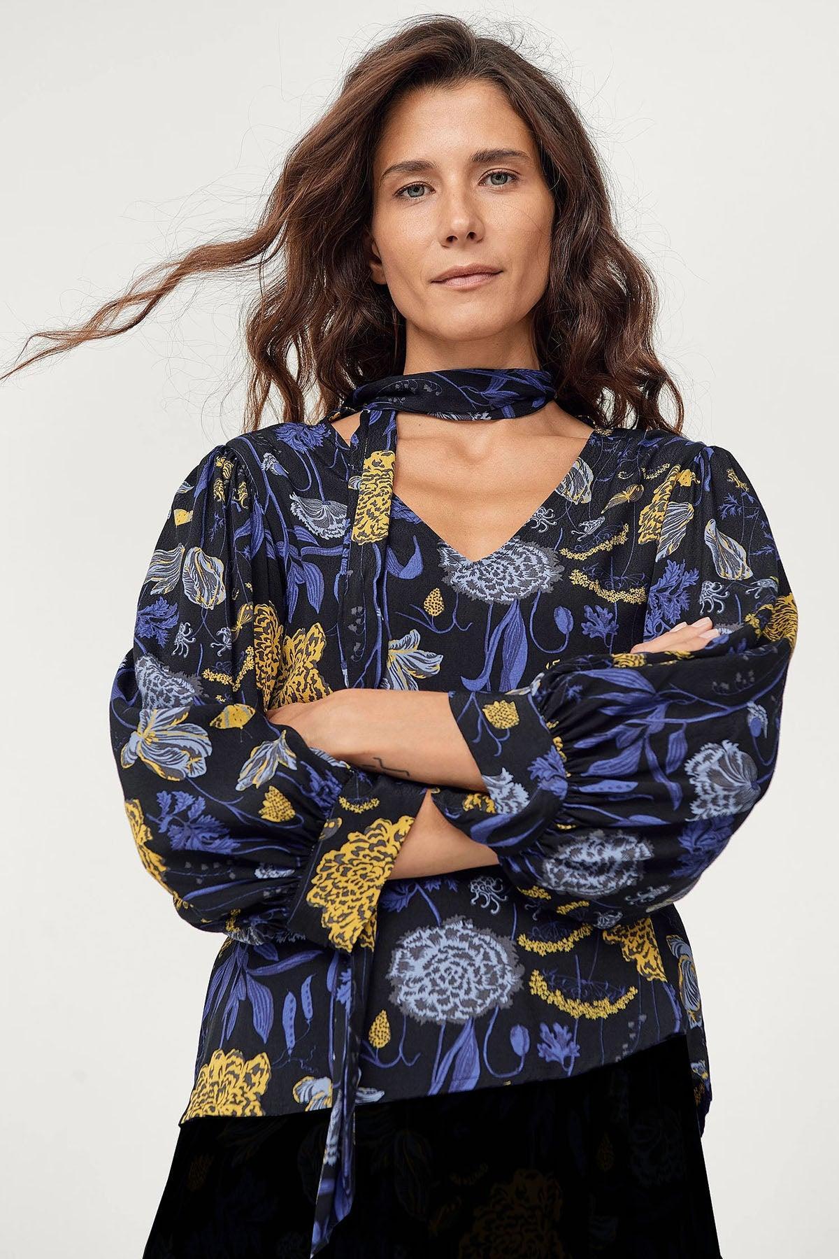This pretty floral blouse will take you from office to dinner in style. Made from a beautiful soft drapey viscose fabric in black with blue and ochre floral design print. Cut in an elegant longer length with v neck and tie, 3/4 length puffed sleeves with cuff.