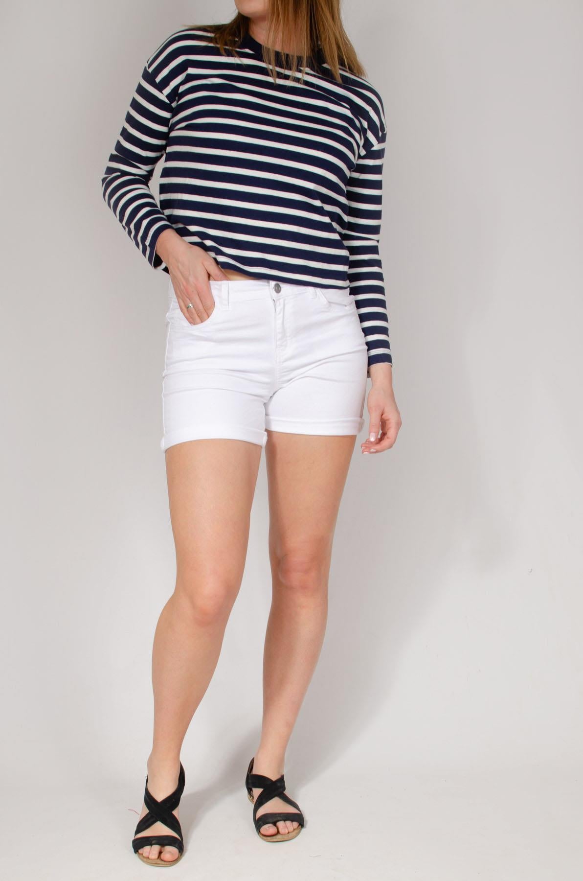 A summer wardrobe isn't complete without these classic white shorts. These are a great lightweight and comfortable addition to your summer wardrobe! A stretch fit with zip fly, mid/high raise waist. Paired here with our navy white stripe long sleeve top, but these work with just about everything/