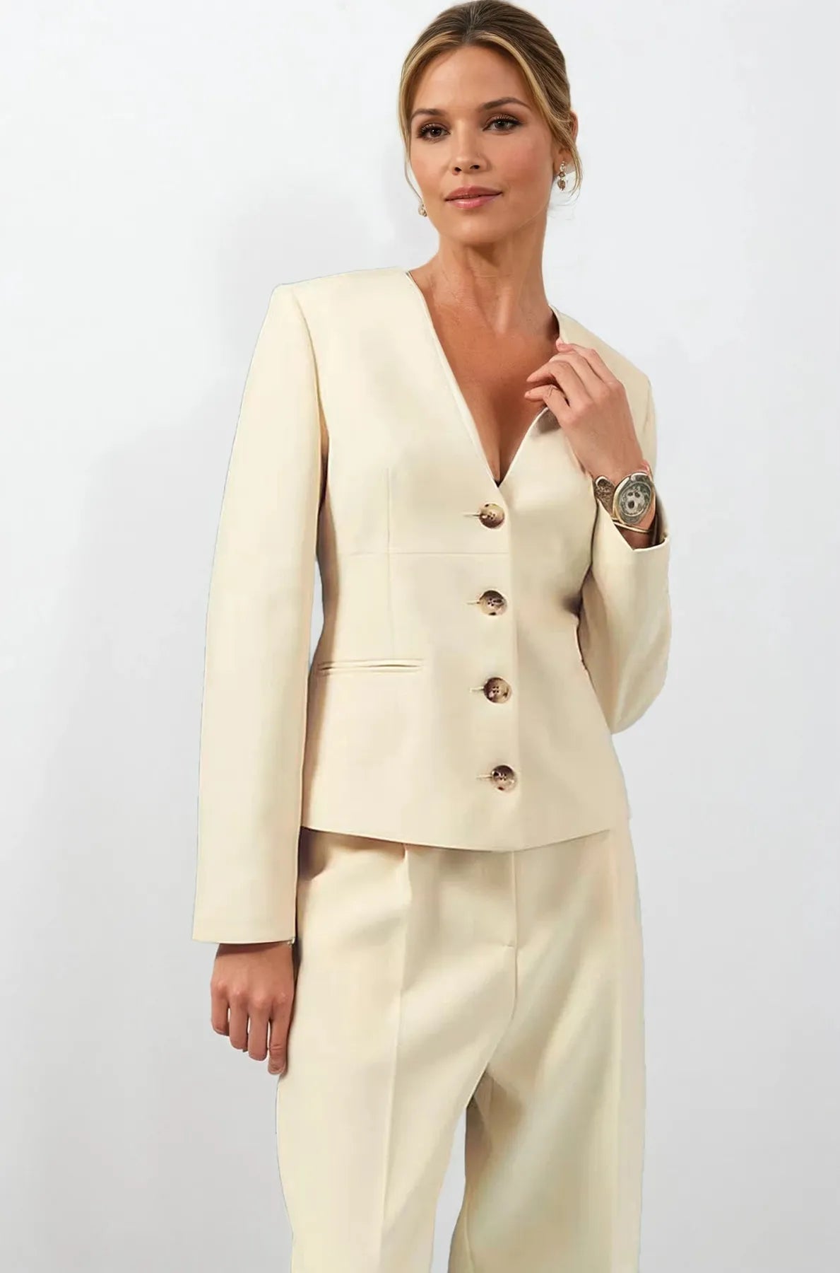 The perfect blazer for special meetings or your next big event. Featuring a deep V neckline with 4 button fastening finished with welt pockets. This is a jacket to team with your favourite blouse - go colourful or ruffles...