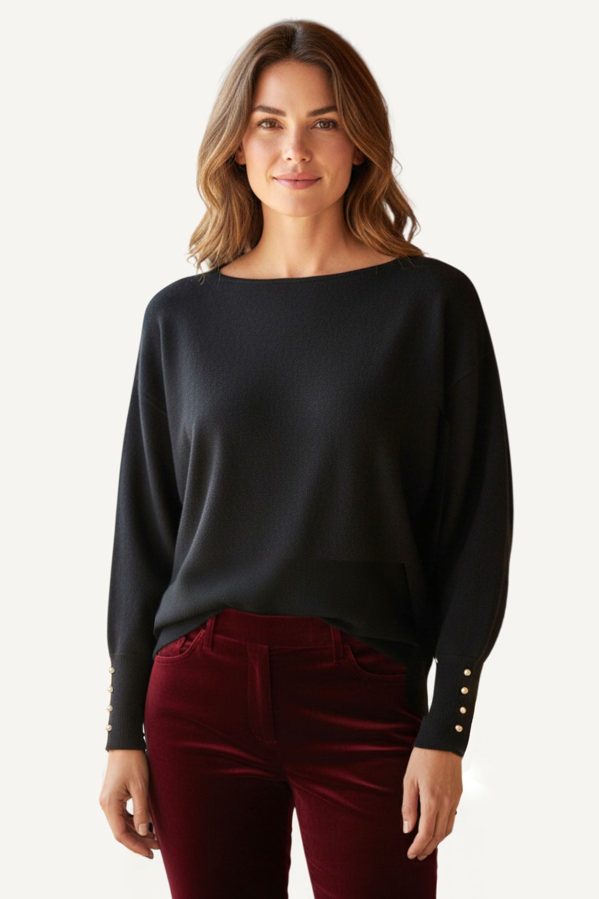 This striking black jumper, designed for understated sophistication with pearl beaded deep cuffs, and relaxed batwing sleeves for a flattering, contemporary silhouette. The classic boat neckline keeps the look polished and versatile—perfect for layering or wearing solo. A wardrobe essential that bridges casual comfort with elegance.