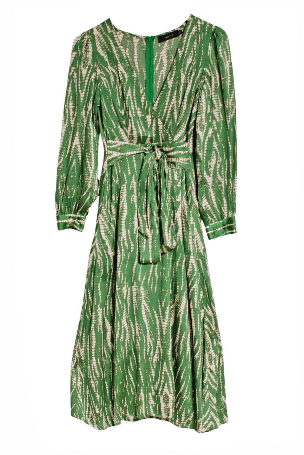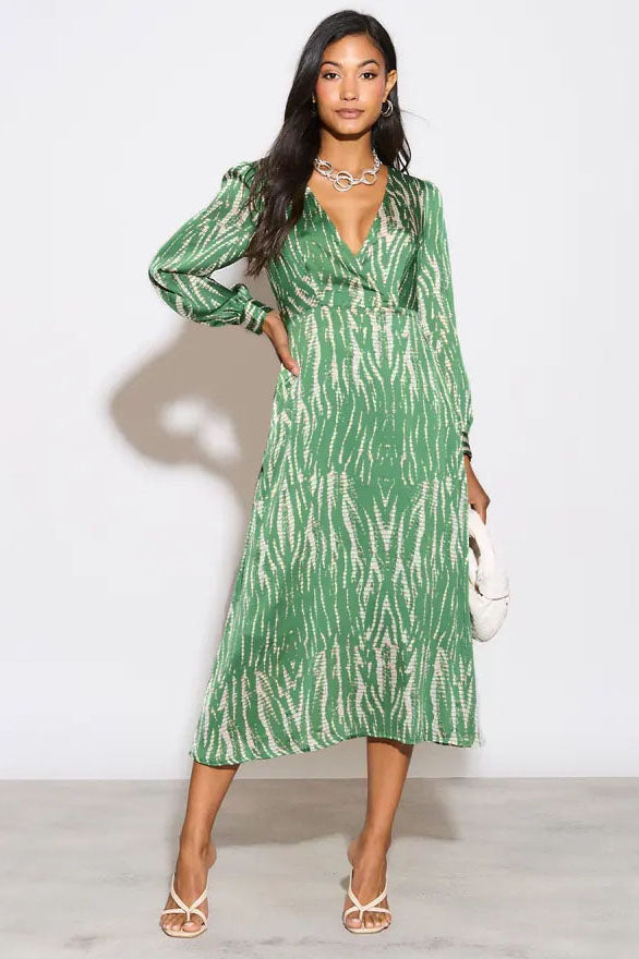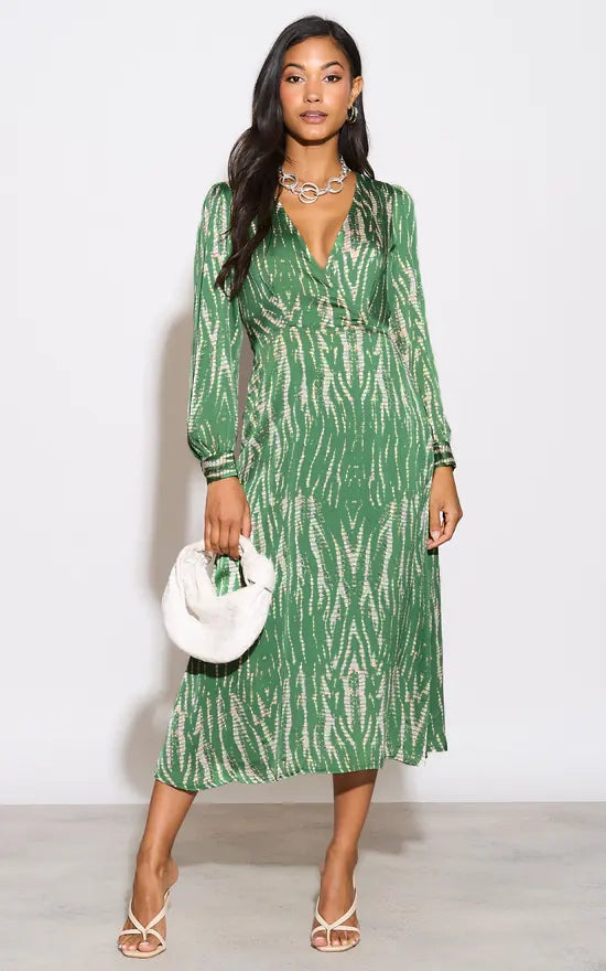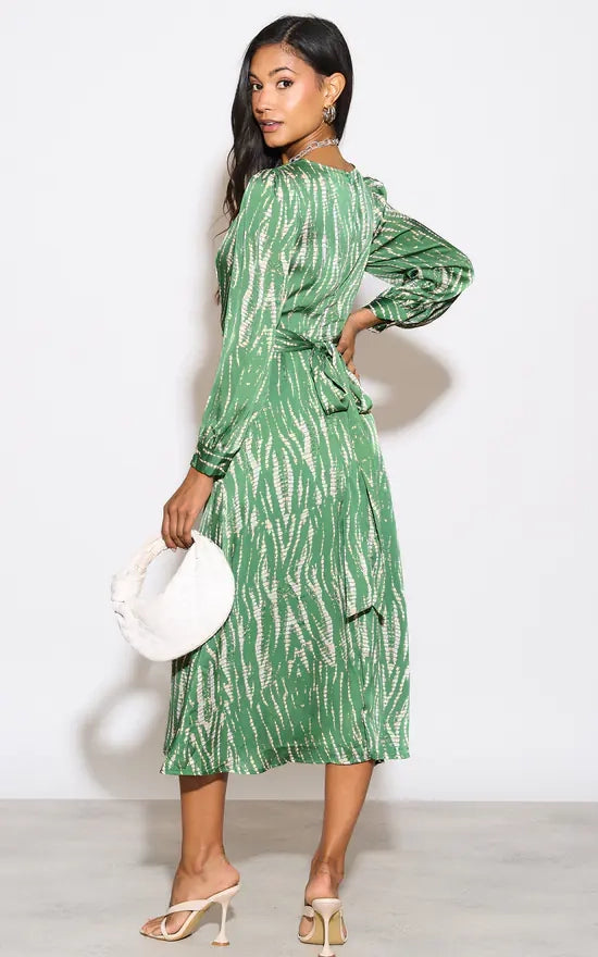 Cut in a fabulous abstract print silky satin fabric, this dress exudes luxury and style. The long puff sleeves with button cuffs add a touch of elegance, while the high waisted design and v neck line give a flattering silhouette.
