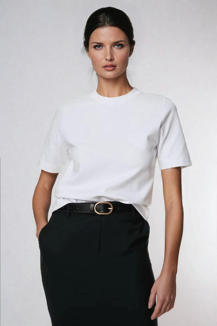 Premium quality ladies T-shirt crafted from thick cut cotton, for a soft but breathable wear. Super comfy and flattering relaxed fit, with stretch. Crew neck and mid-short sleeve for a contemporary feel. Pick your favourite colour and pair with anything - versatile but elegant classic cut.