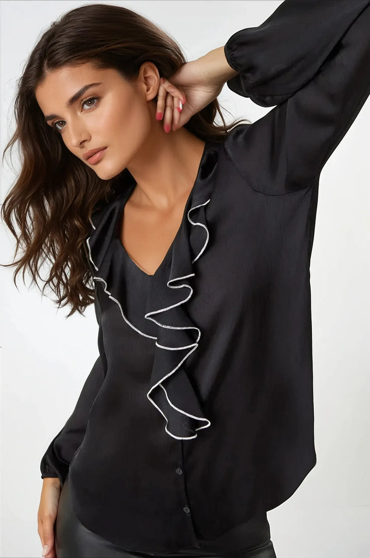 Let your outfit do the talking with our elegant v-neck satin blouse. Adorned with a charming ruffle front and button detail, this blouse boasts a full opening with a feminine v-neckline. Featuring cosy long sleeves finished with elasticated cuffs while staying stylish in a flattering hip-length blouse shape. Perfect for parties or work, this comfortable woven blouse pairs beautifully with wide-leg trousers.