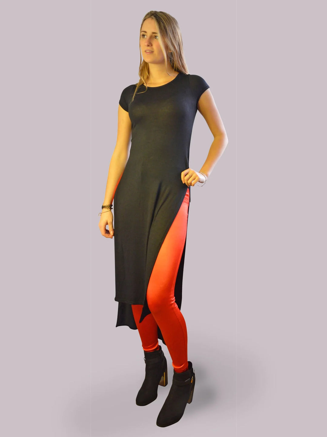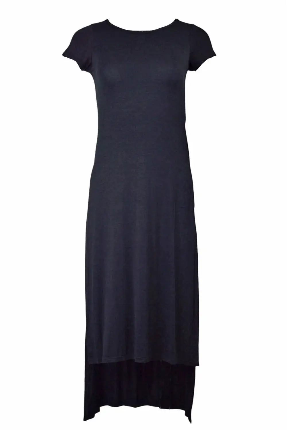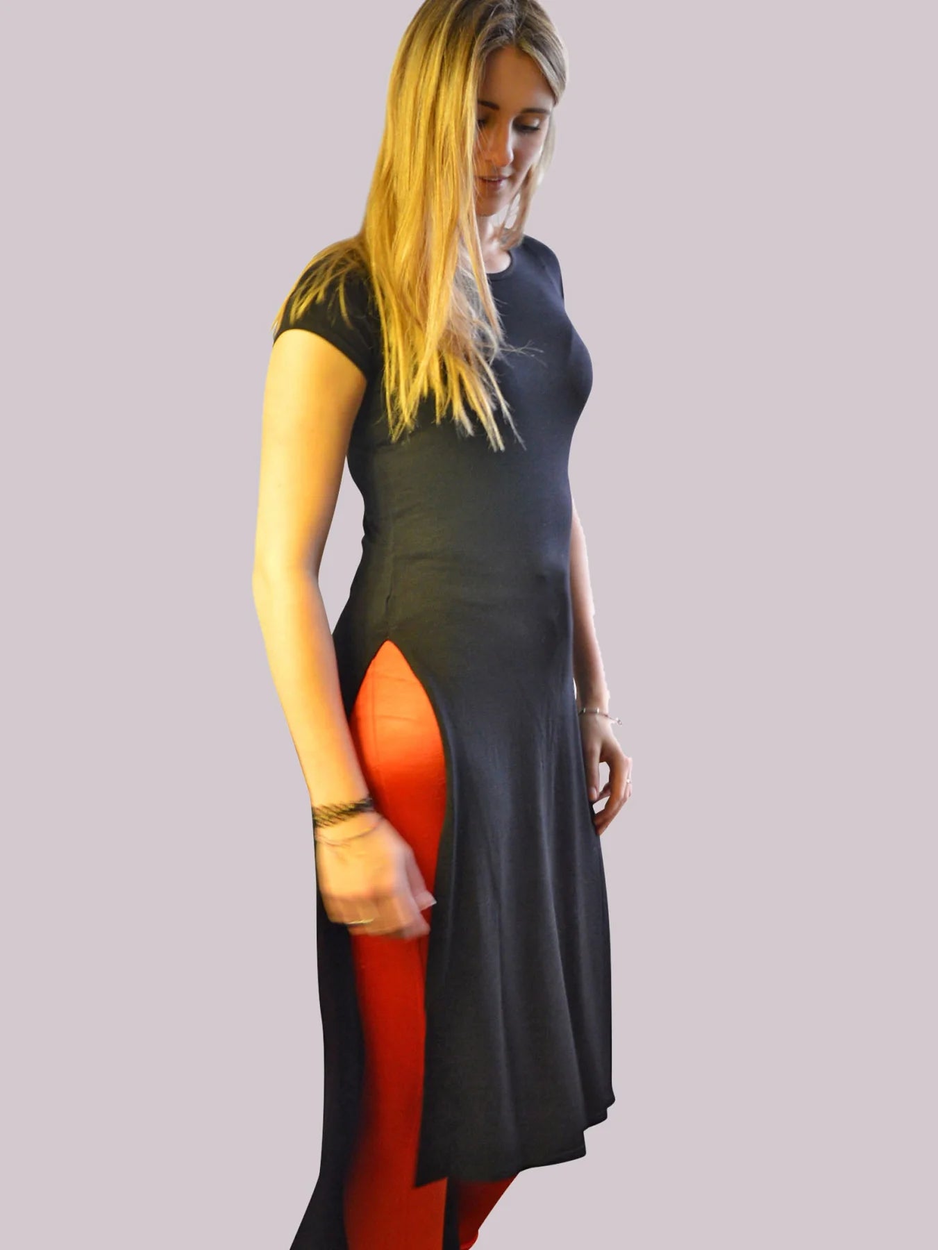 Bang on Trend Black Dress with Splits to waist, Looks fantastic over trousers or fancy tights/leggings, Stretch Fit Maxi Dress with cap sleeves
