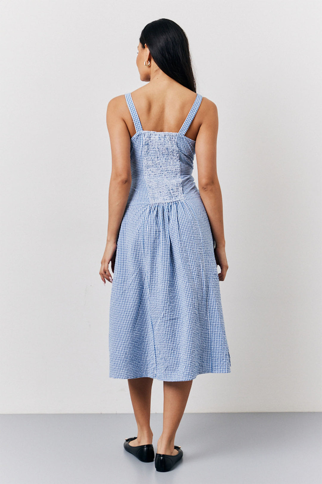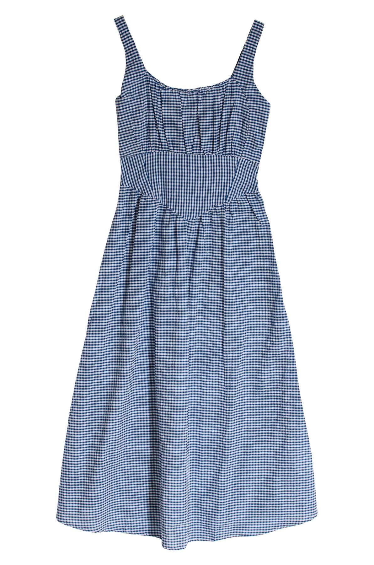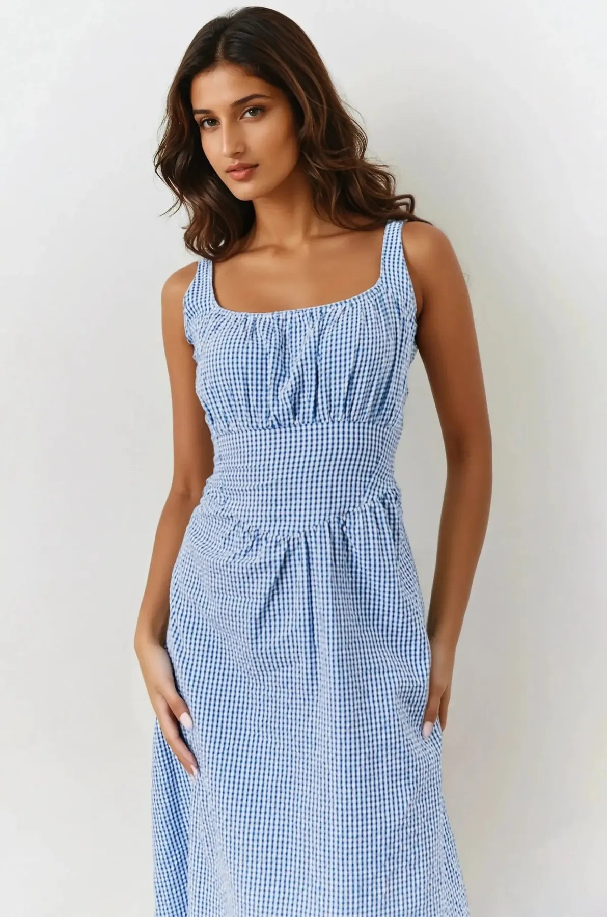 In a blue seersucker gingham print this dress adds a playful yet chic vibe to your look. Perfect for sunnier days or casual outings. Pair it with sandals or dress it up with strappy sandals and statement earrings for a look we’re loving.