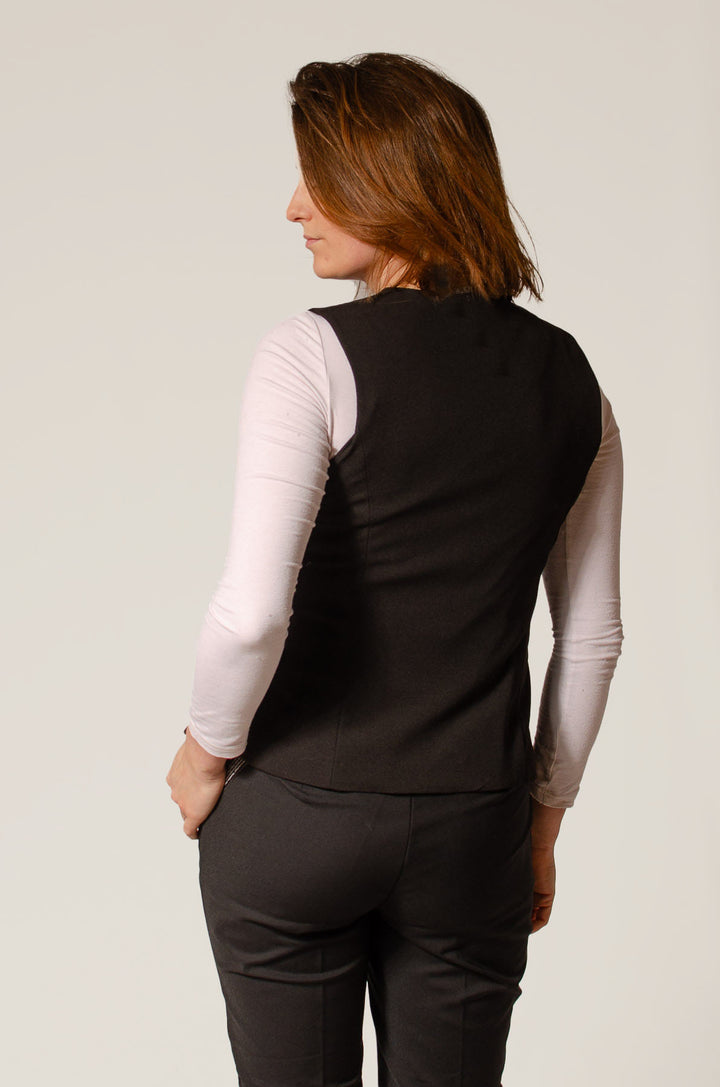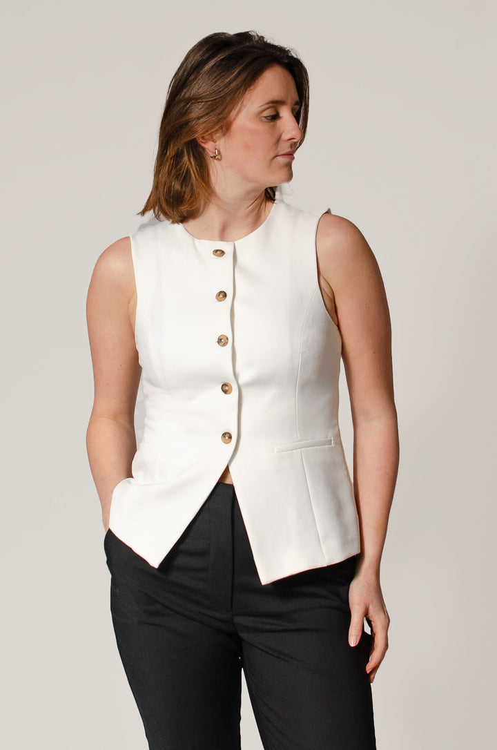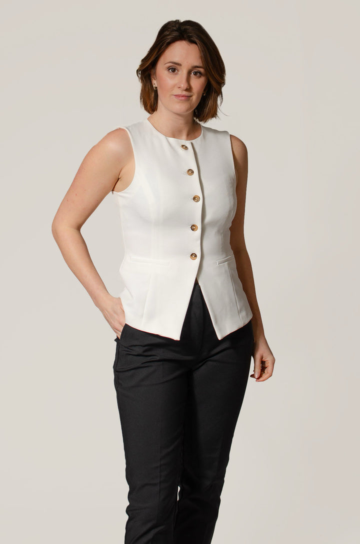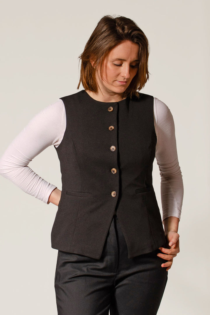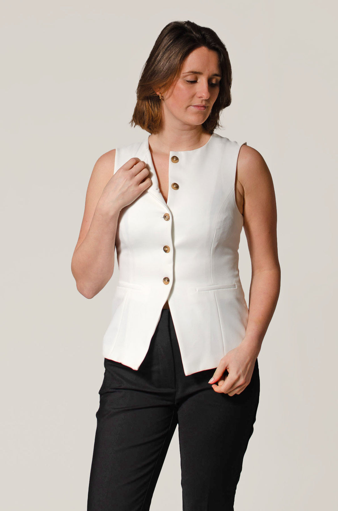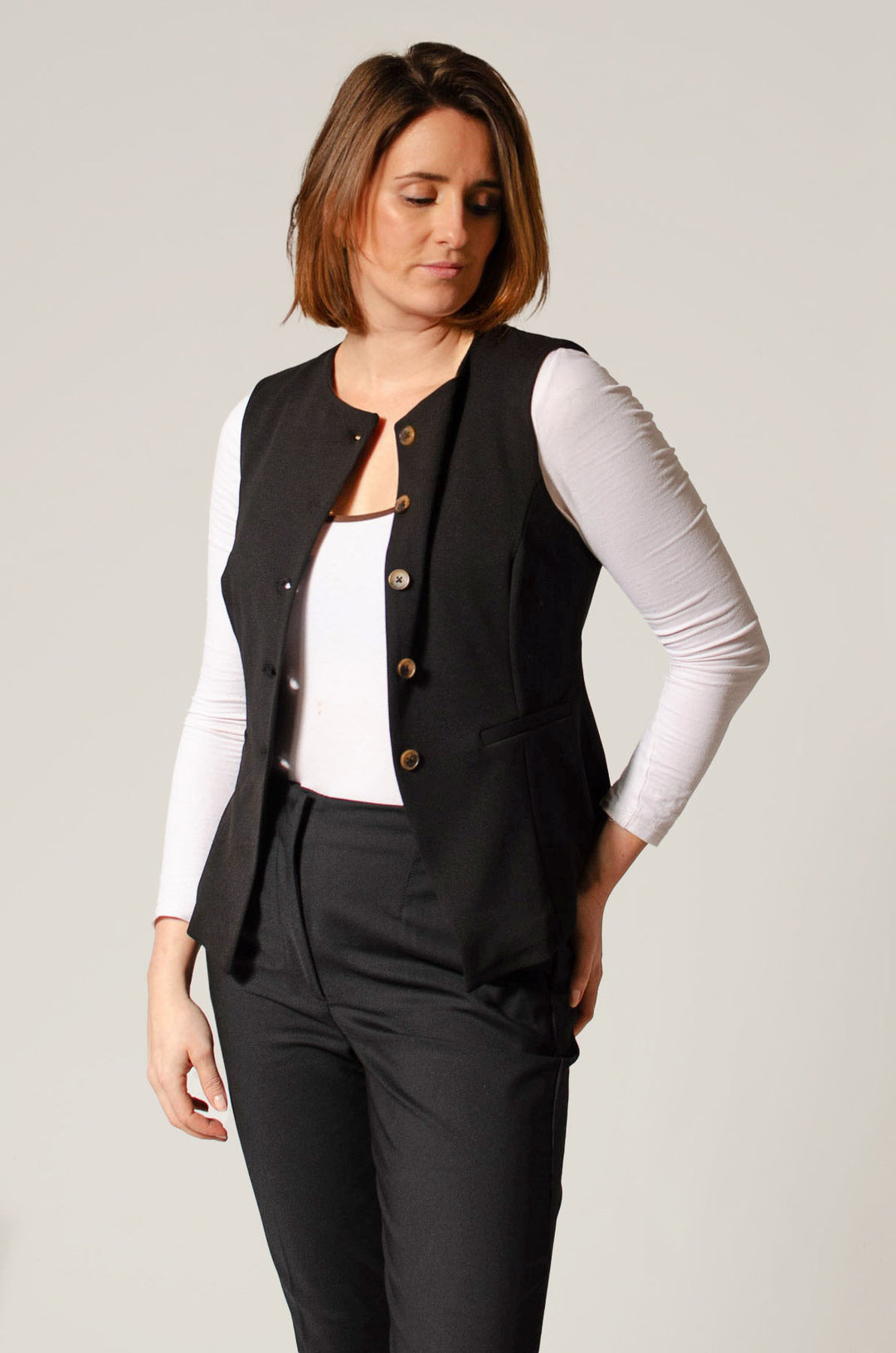 Discover the perfect blend of style and functionality with this tailored waistcoat. Featuring a flattering round neck, button front, and tailored fit, this waistcoat is designed to accentuate your curves and discreet front pockets.