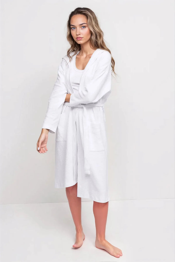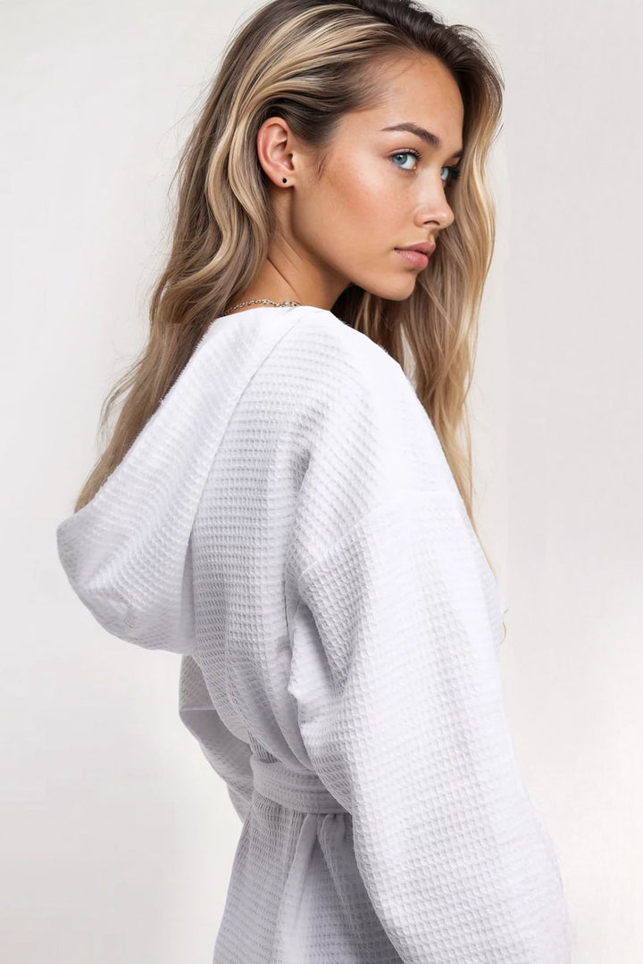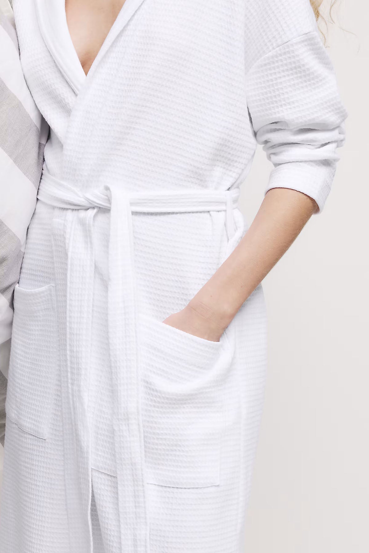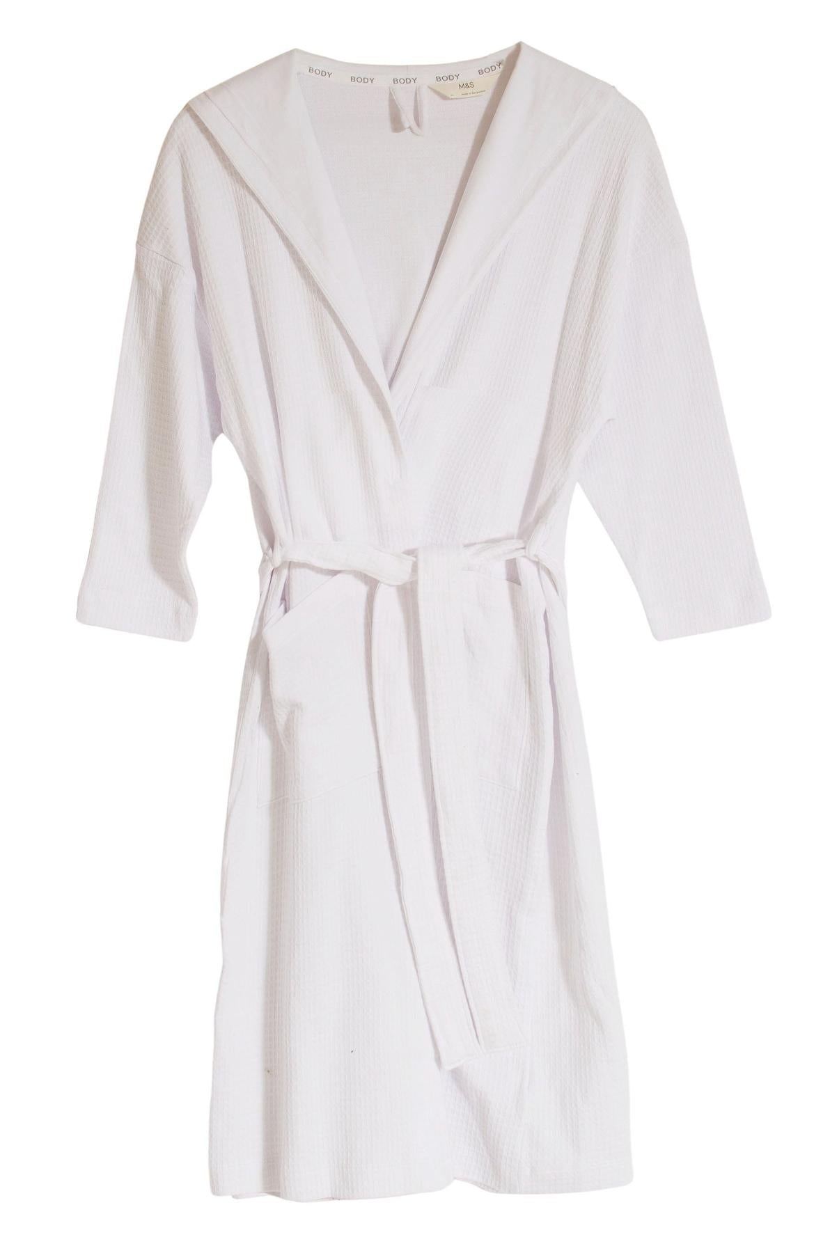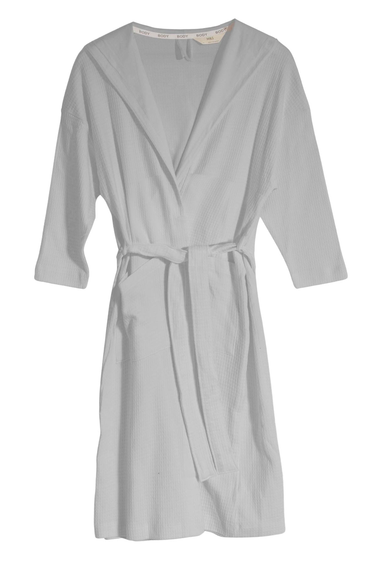 Laidback pyjama days were made for this pure cotton dressing gown. Comfy regular fit in a flattering short length. Hooded for a super cosy feel. Lightweight jersey fabric with a waffle texture for a tactile finish.