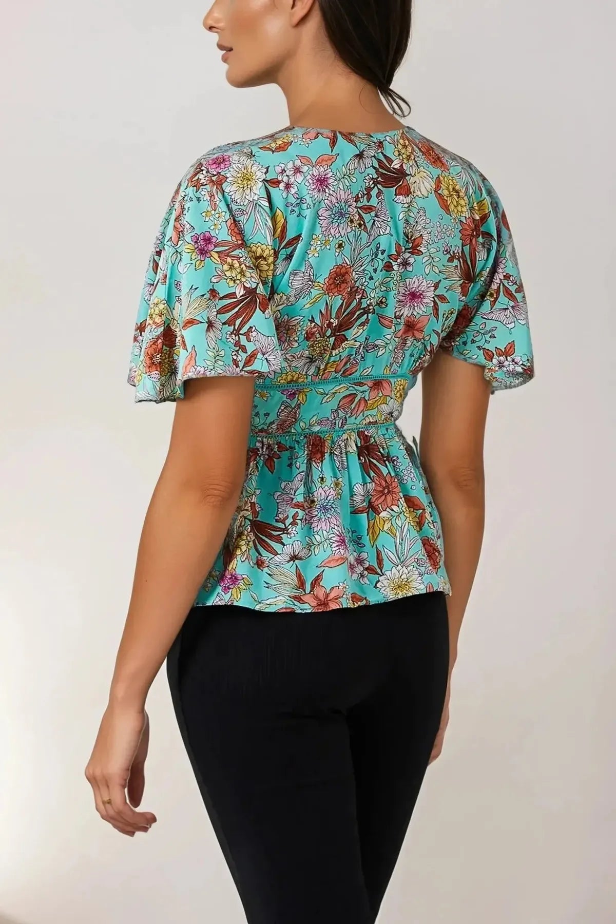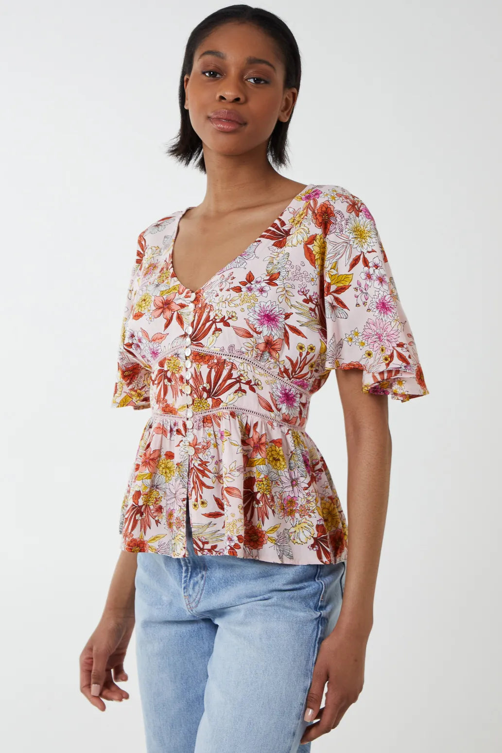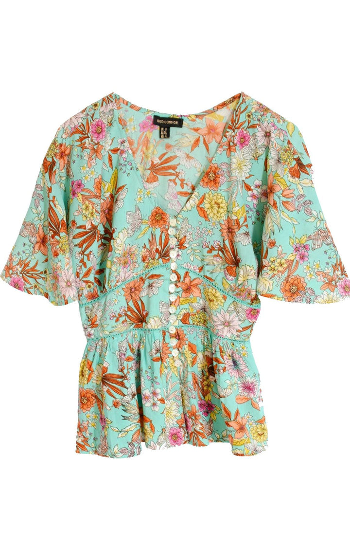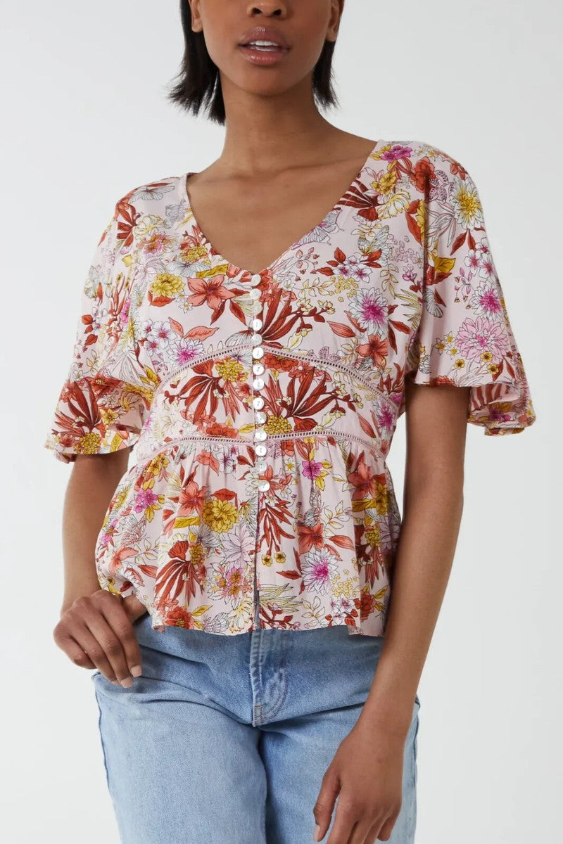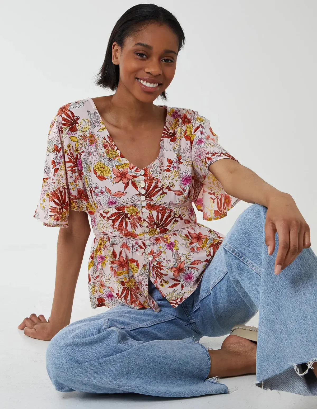 Effortless elegance in this pretty summer blouse. Designed with short batwing sleeves, it offers a cool and comfortable fit for the warmer months. The button-front and V neckline create a flattering fit, while the high waist with inset ladder lace adds a delicate, feminine touch.