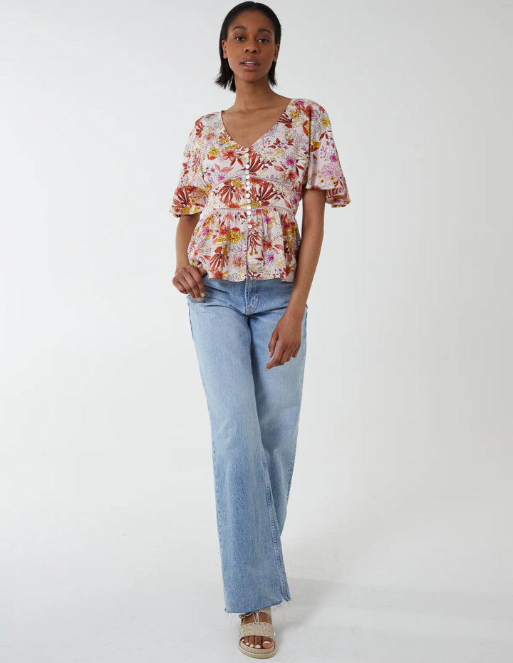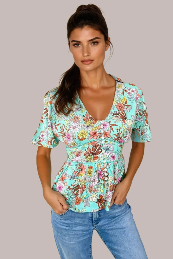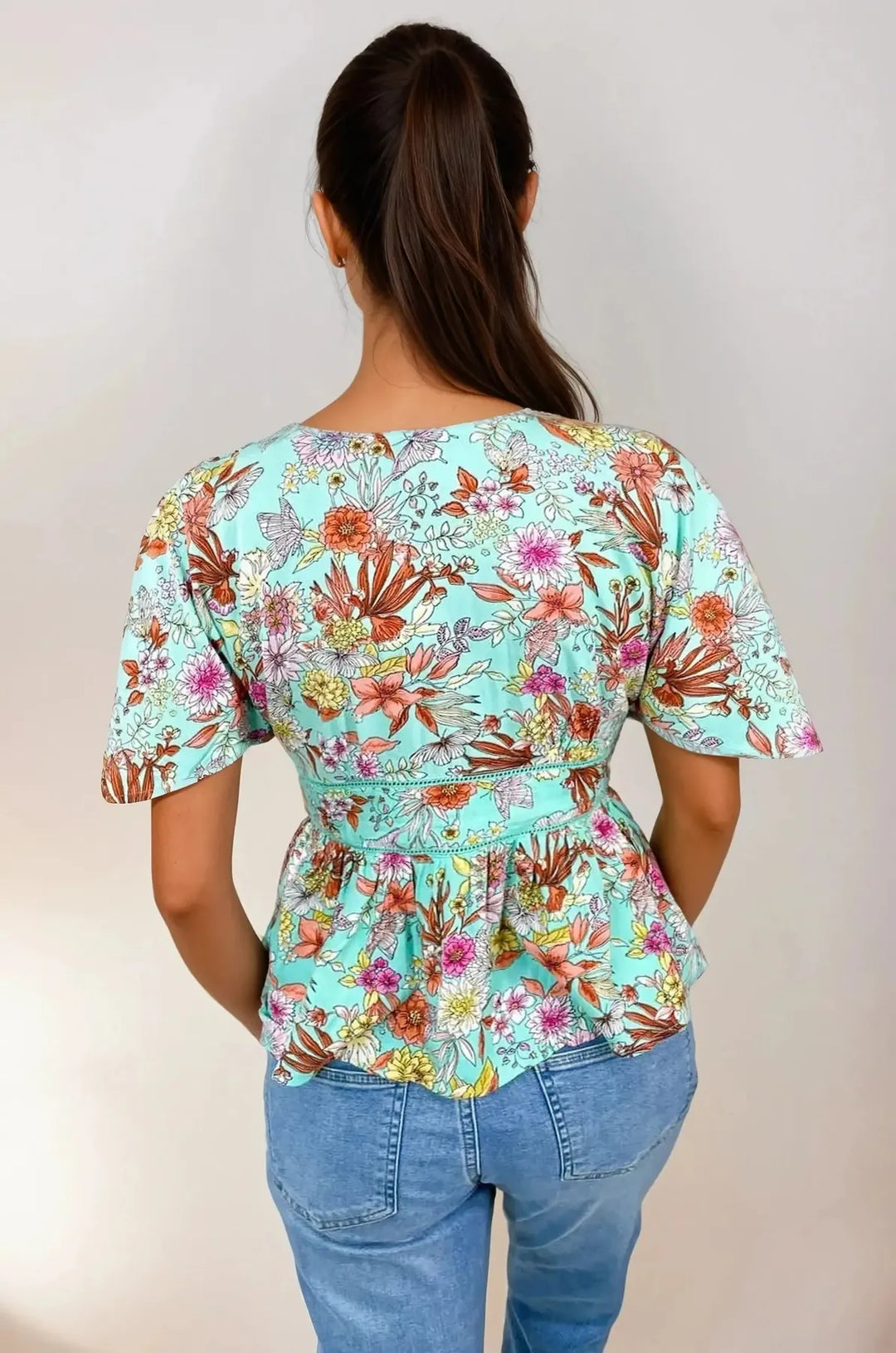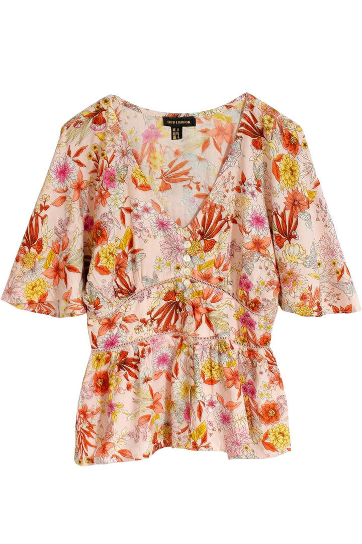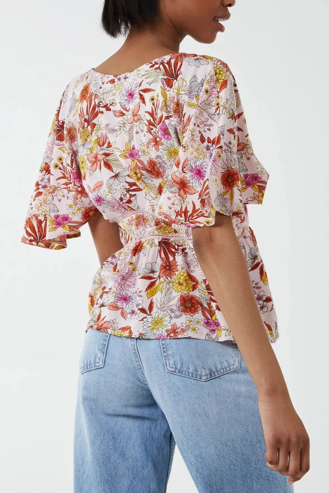 Effortless elegance in this pretty summer blouse. Designed with short batwing sleeves, it offers a cool and comfortable fit for the warmer months. The button-front and V neckline create a flattering fit, while the high waist with inset ladder lace adds a delicate, feminine touch.