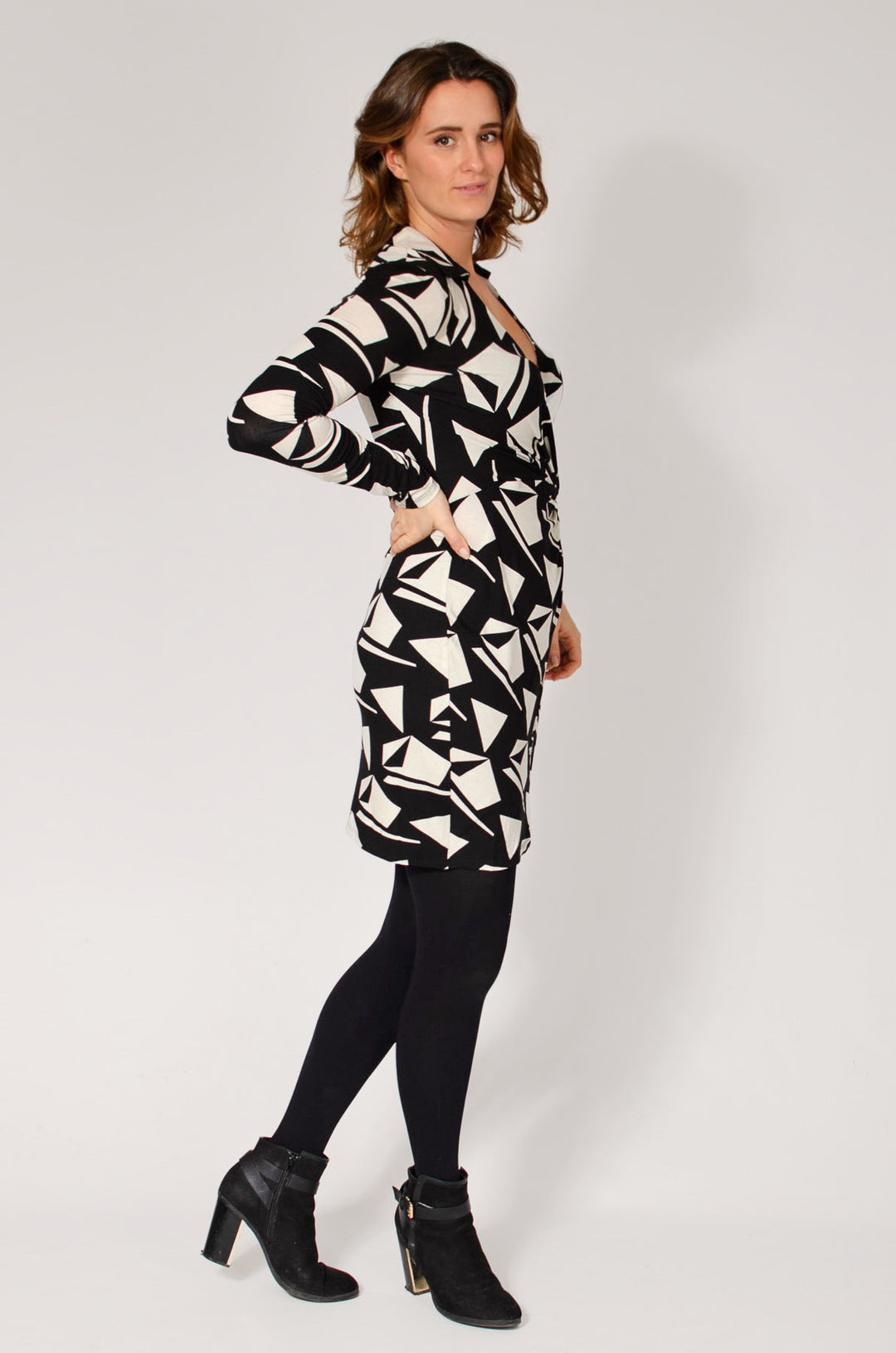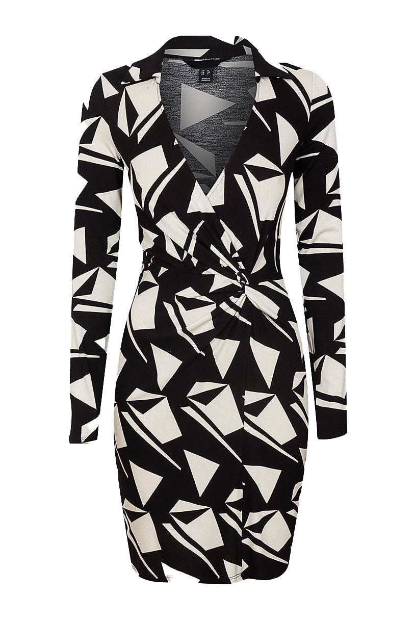 80's retro geometric print which is having an absolute moment, this dress is a stylish piece. Super soft & flattering stretch fit mini dress with a wrap style and knot waist for a cinching silouette. Perfect with tights and heels for the office or evening, or pair with chunky boots for a more casual look.