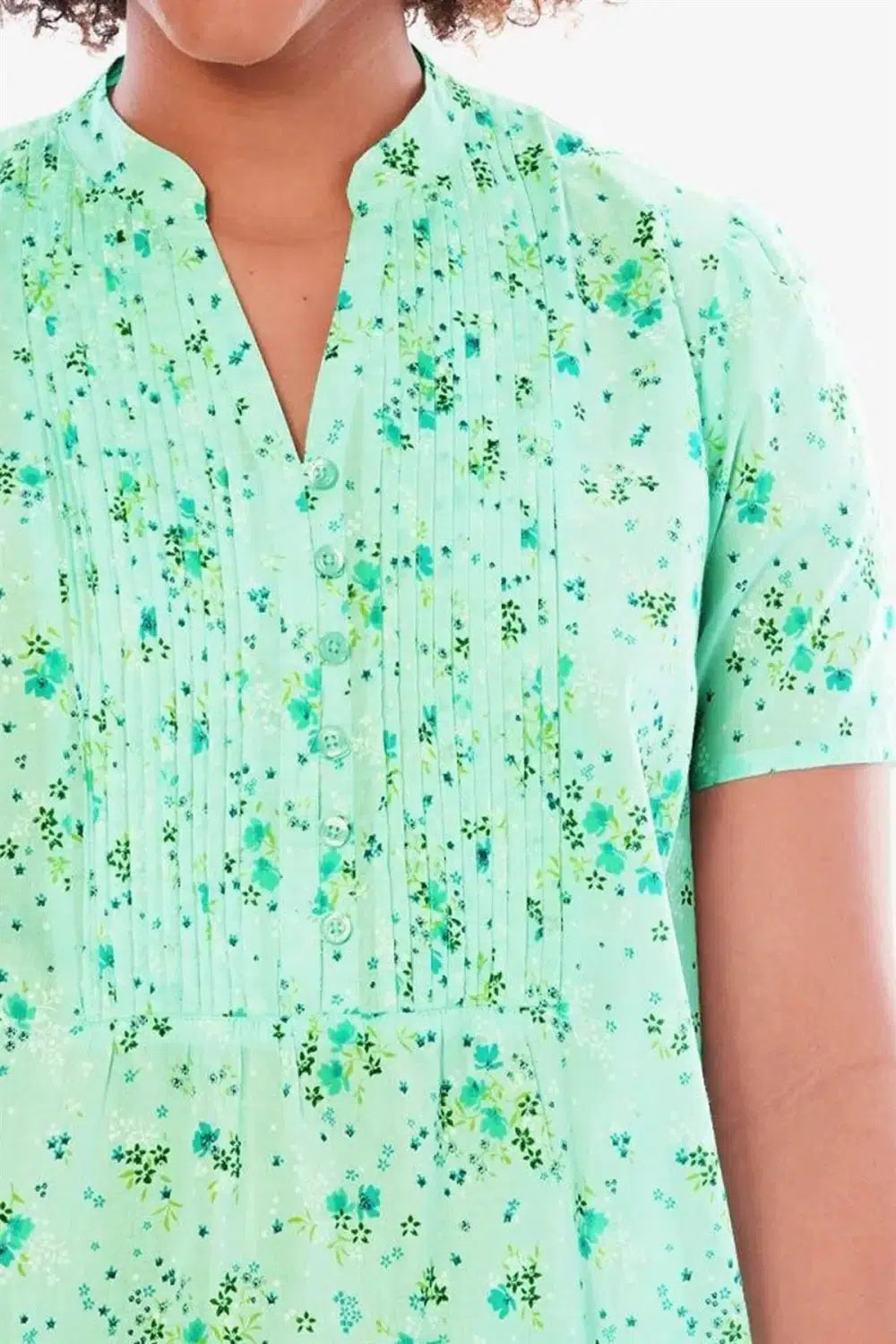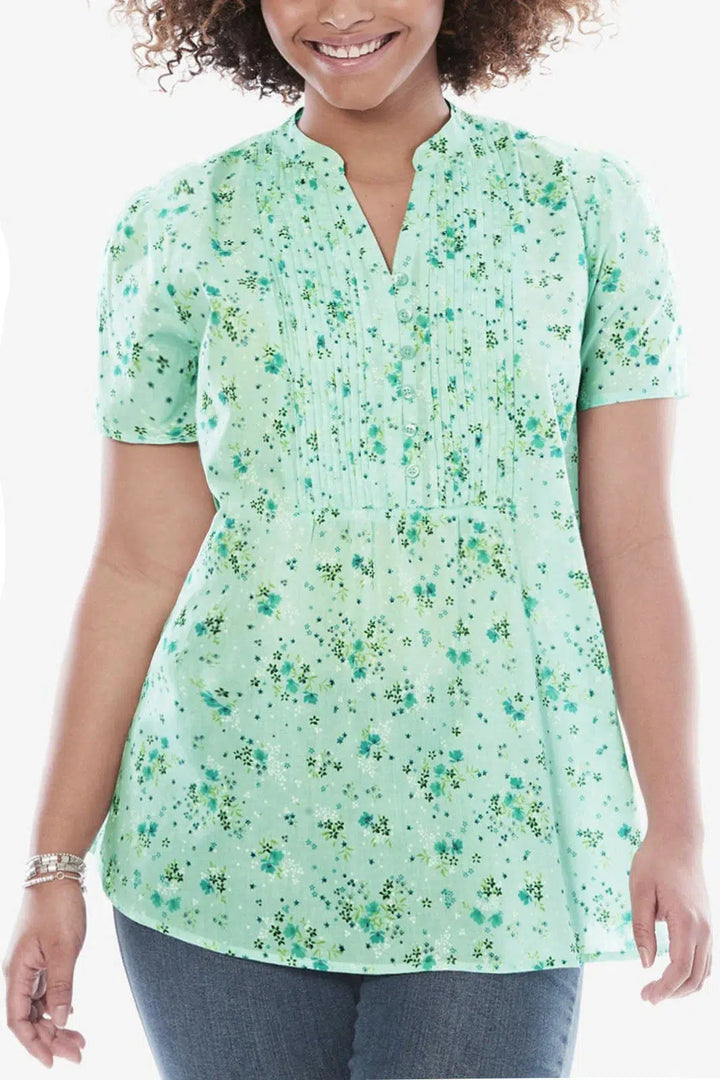 This pretty floral blouse is made from pure 100% cotton for the ultimate in cool comfort for summer. With pretty tuck front and V Neck the cut is relaxed, and comes in all plus sizes up to 40.