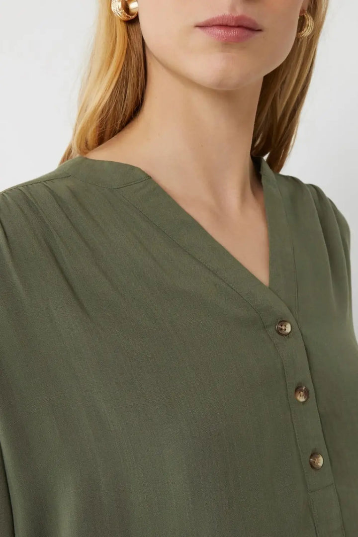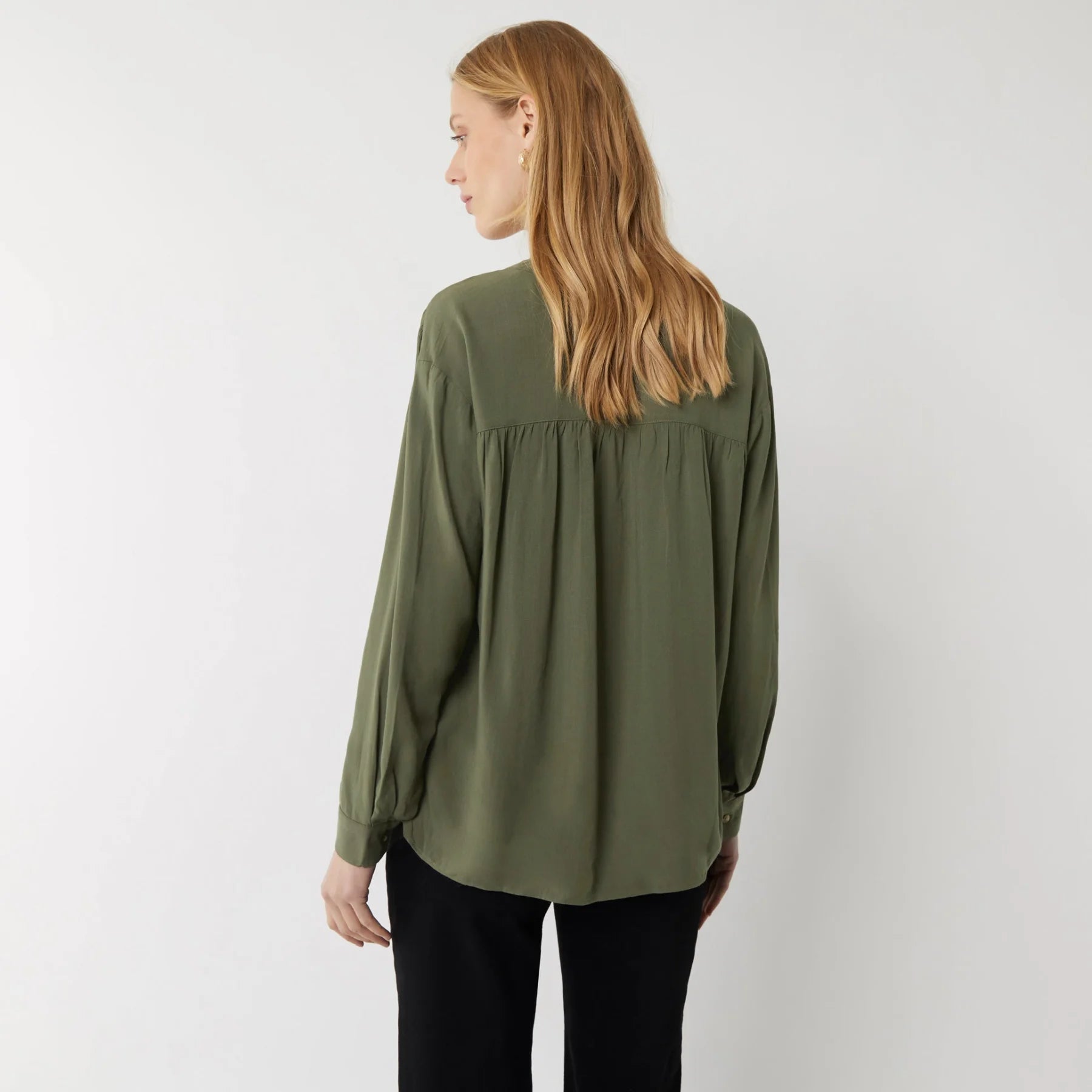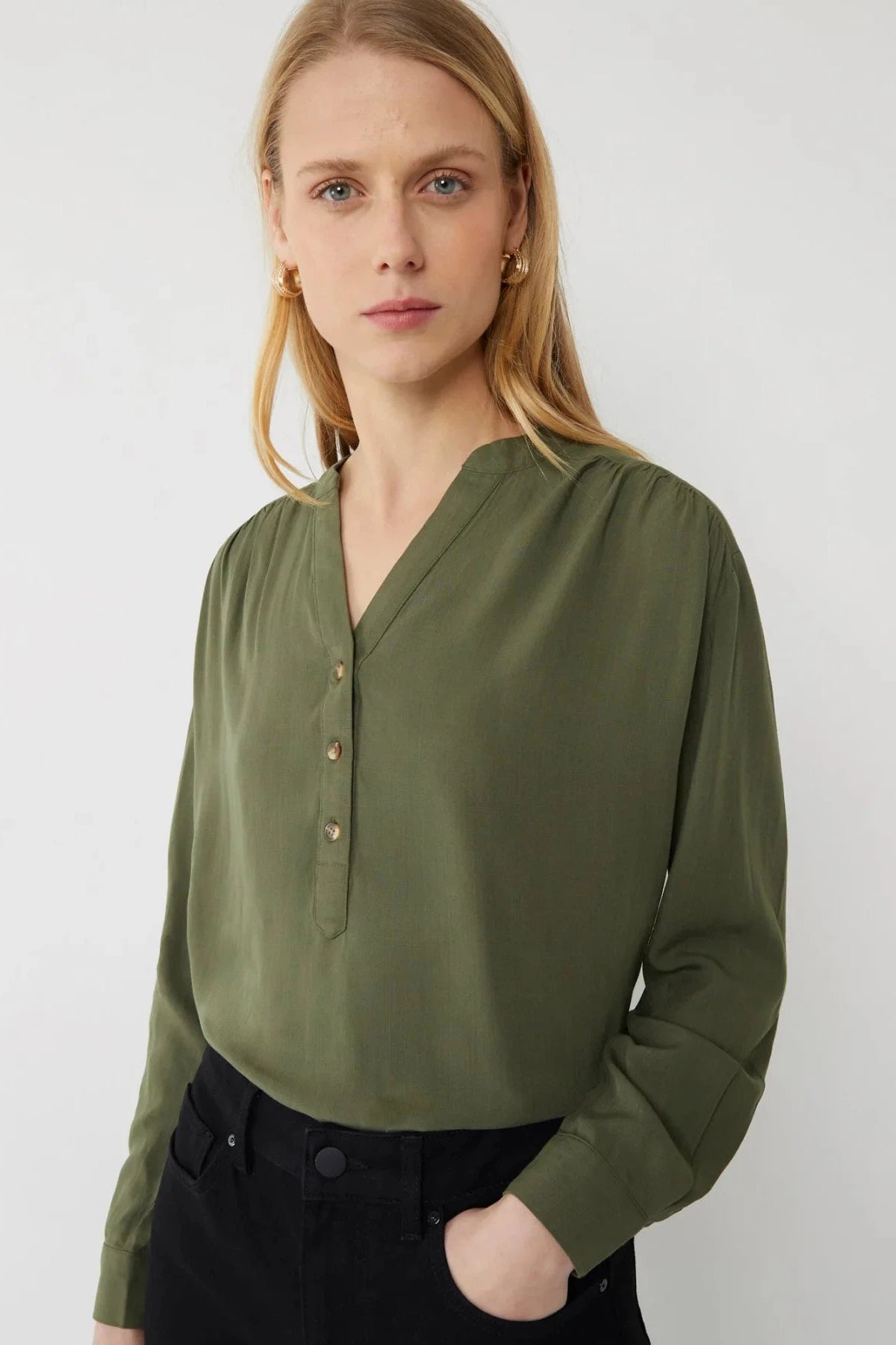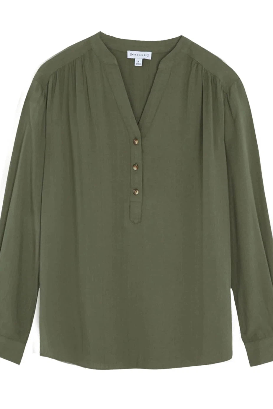 Looking for an easy-to-wear, work-appropriate shirt? With buttons at the neckline and gathered detailing at the shoulders, invest in this long-sleeve overhead top this season. Plus you can dress it down with jeans. Machine washable.