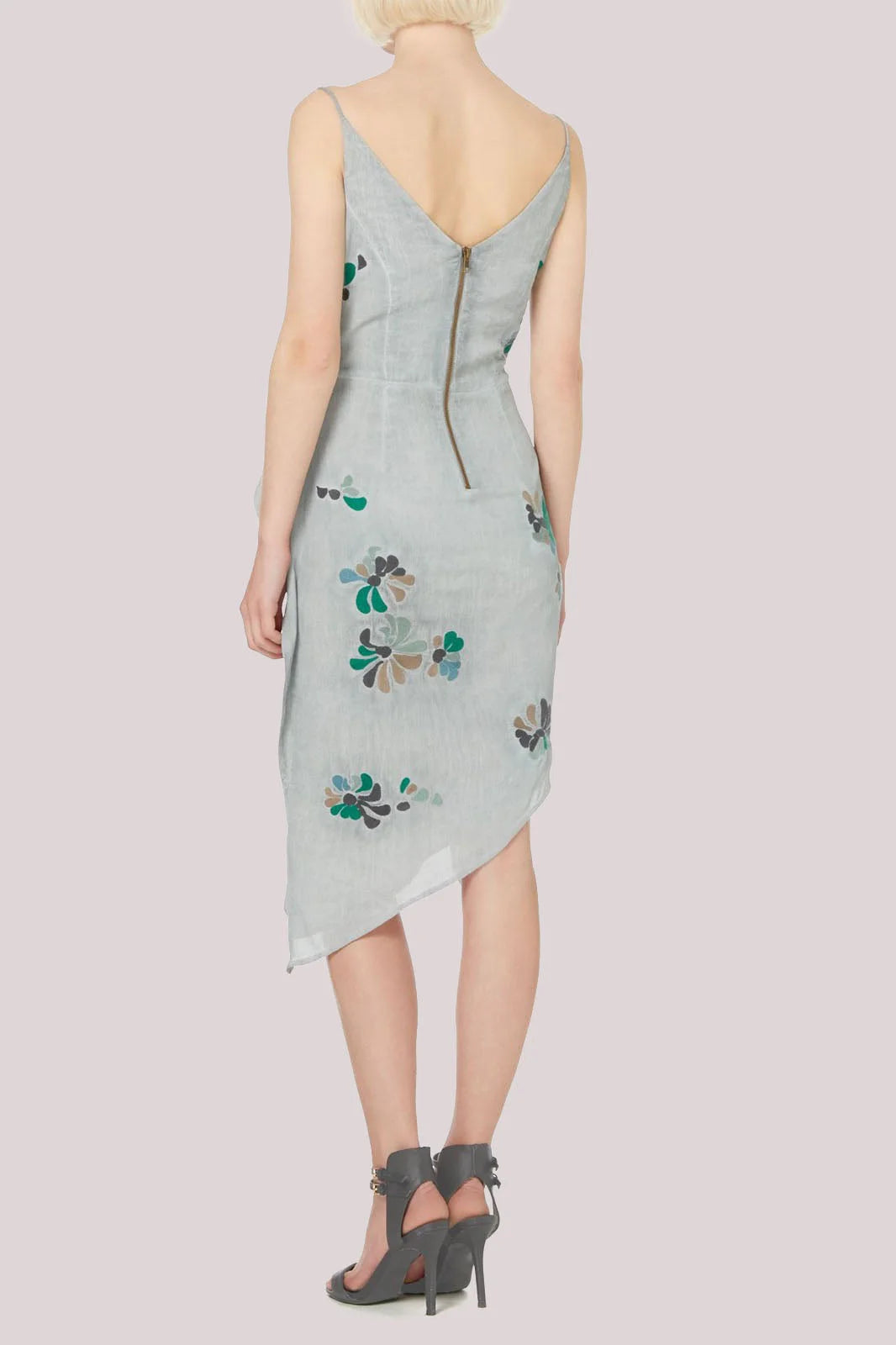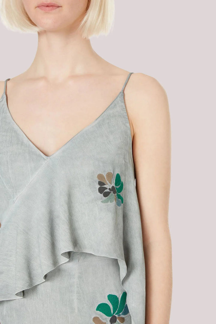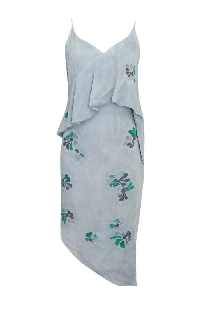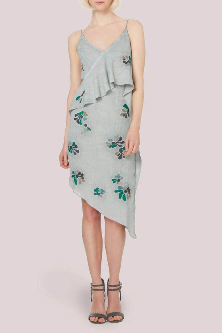 This gorgeous embroidered dress is ideal for the summer months. Beautifully feminine, this washed grey color is complimented with a delicate pattern of petals. The asymmetric hem and layered top make the dress flattering and extra special.