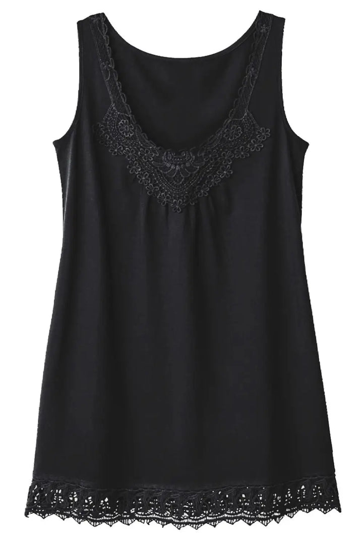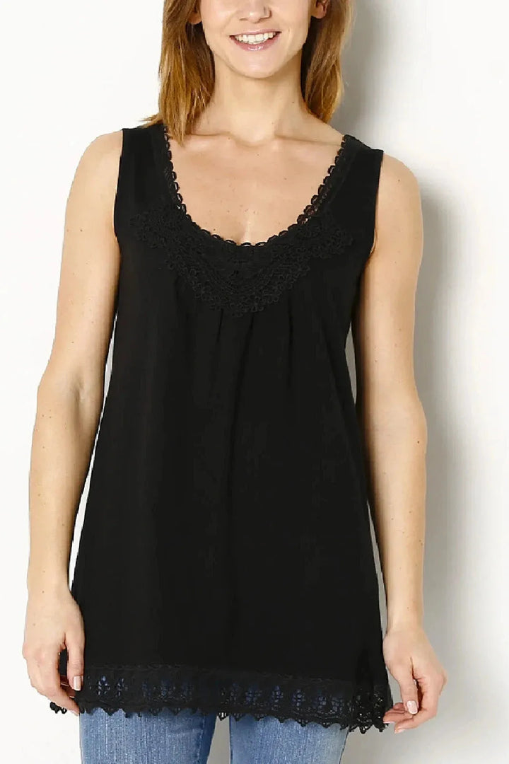 Mix up your must-have tops with the addition of this crochet lace trim top. Cut in a longer length for a flattering look this top will work from day to evening and from summer to winter as a layering piece.