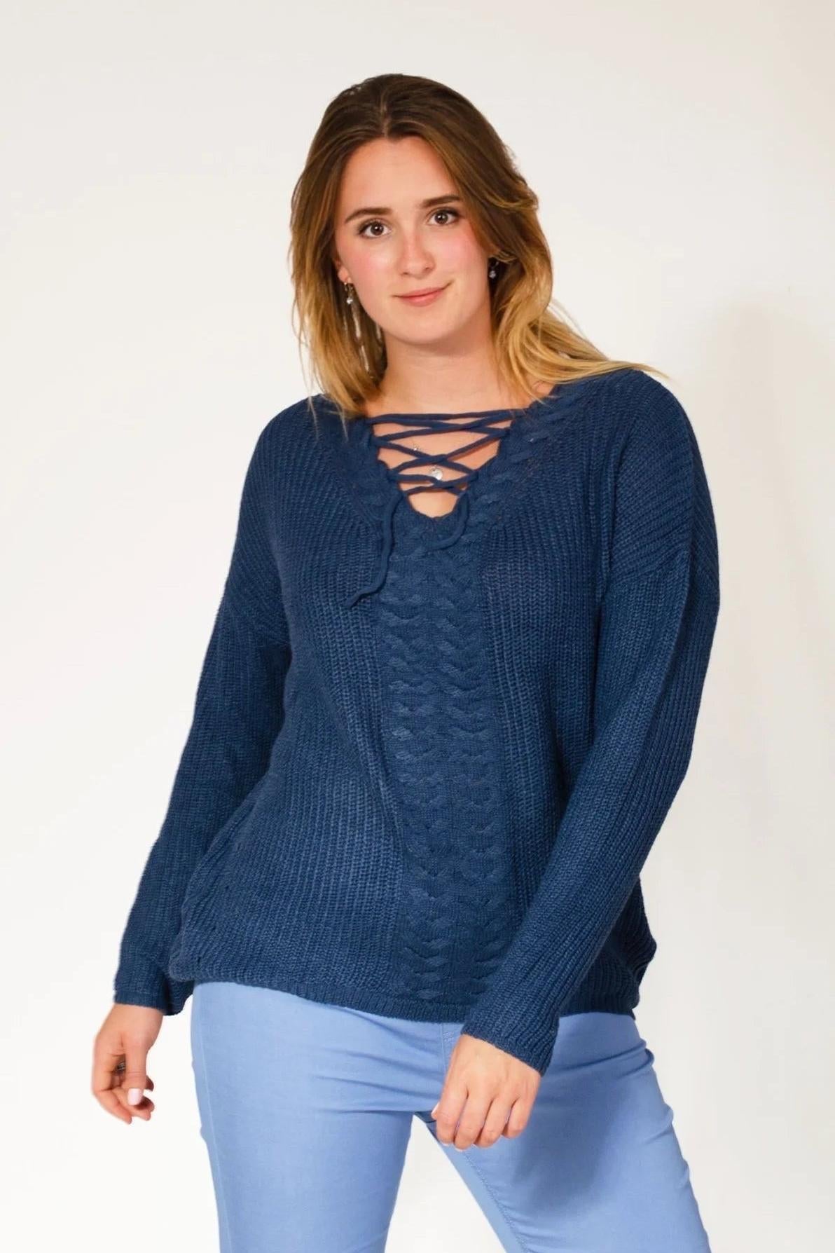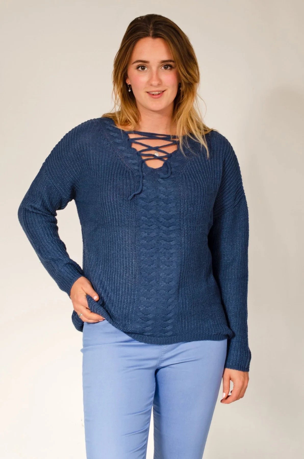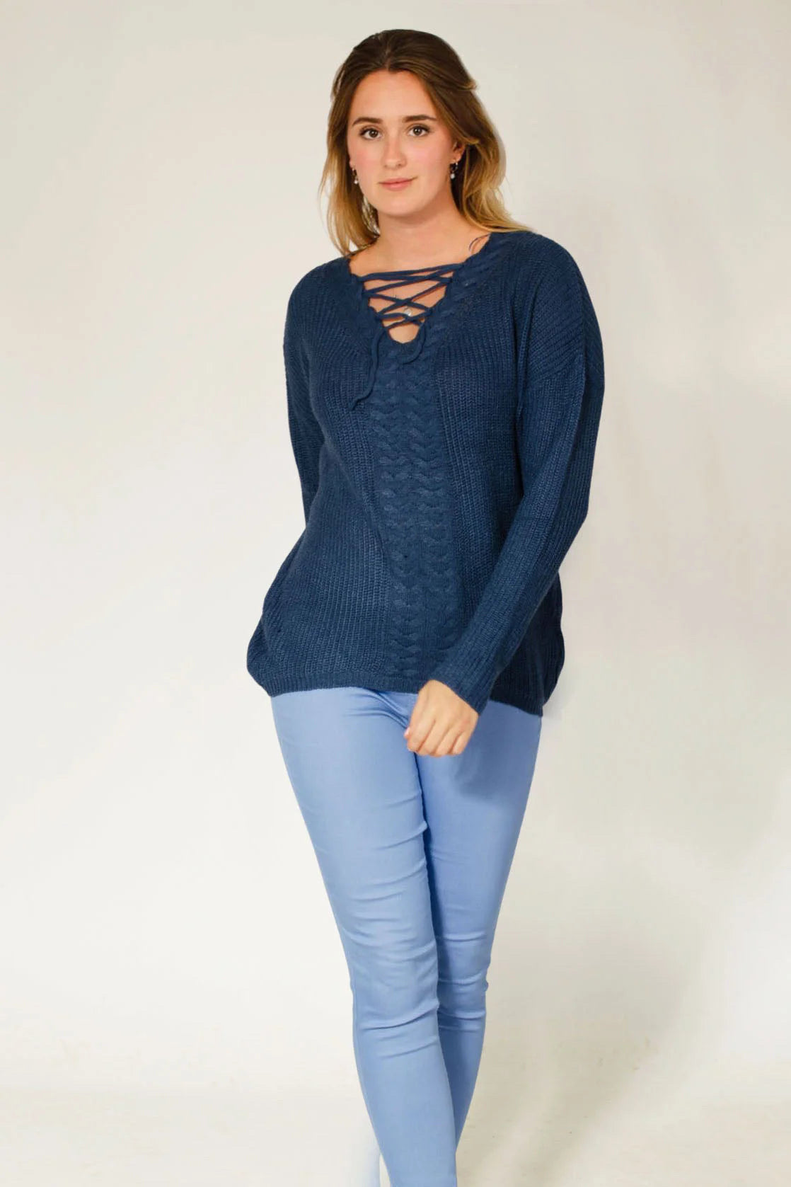 Looking for a jumper just a little different? This one is just the trick. A warm winter jumper with an stylish lace up v-neckline. Also looks good layered over a polo neck!
