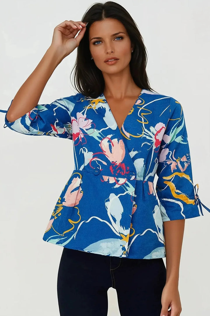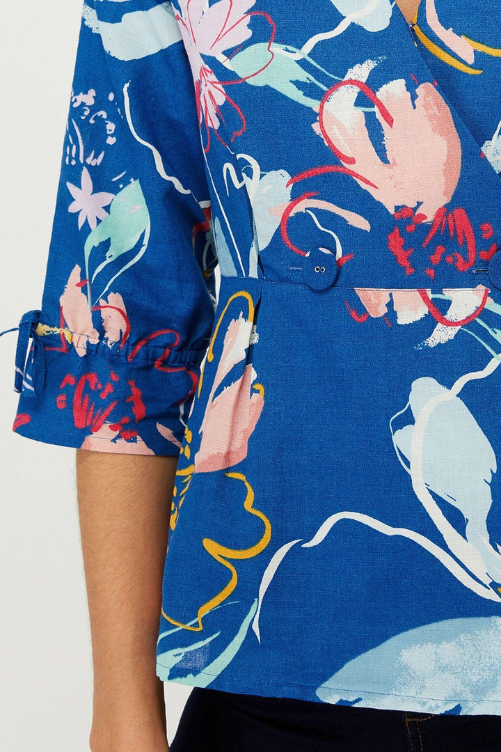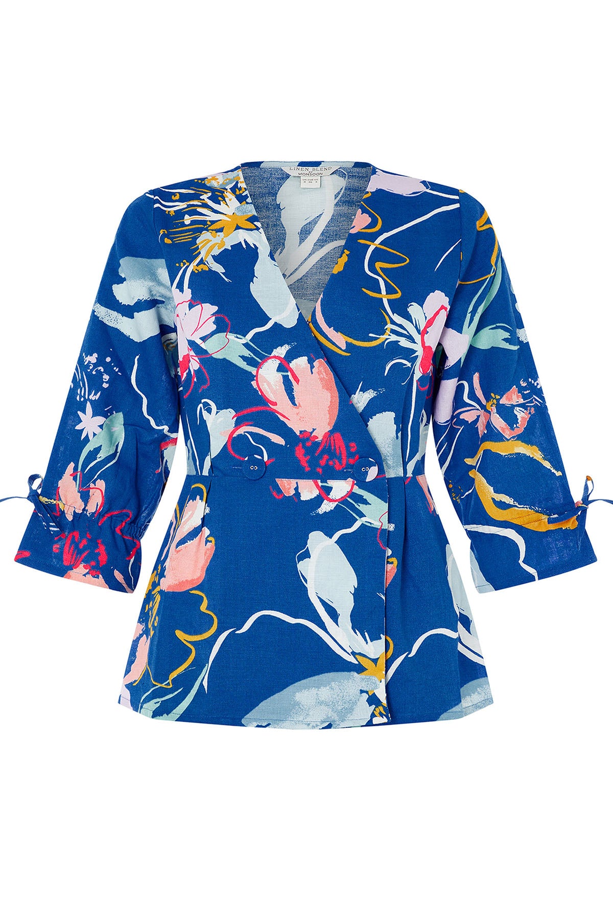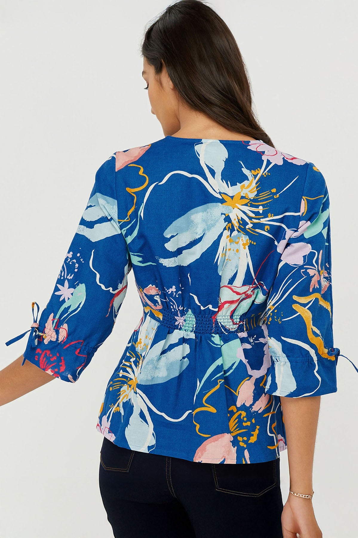 This unique blouse is designed in breathable linen-mix fabric with an artistic floral print. She presents the perfect way to smarten up your go-to looks. Made from a linen blend fabric, with an added stretch-back insert for a flattering shape. Features 3/4 length sleeves with tie cuffs, double button front and a peplum hem