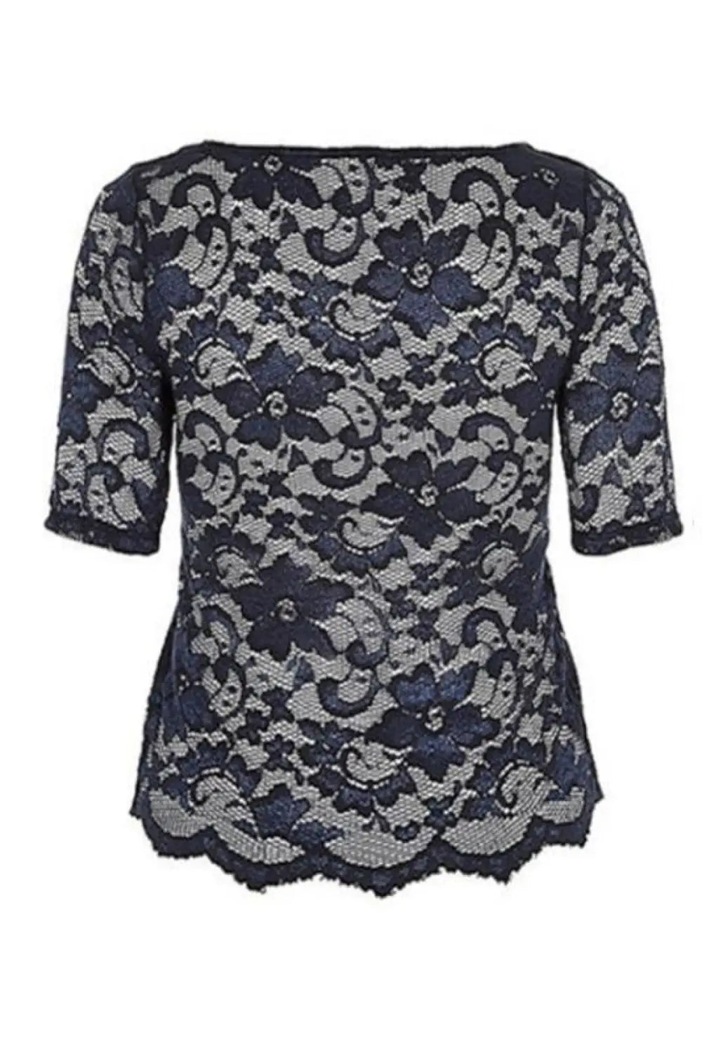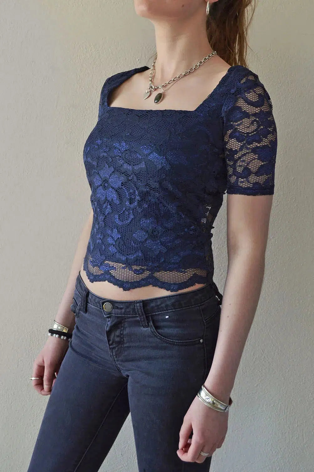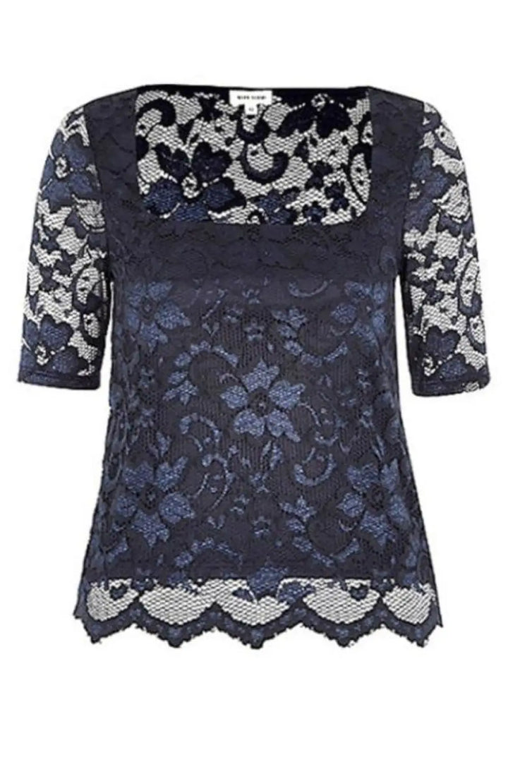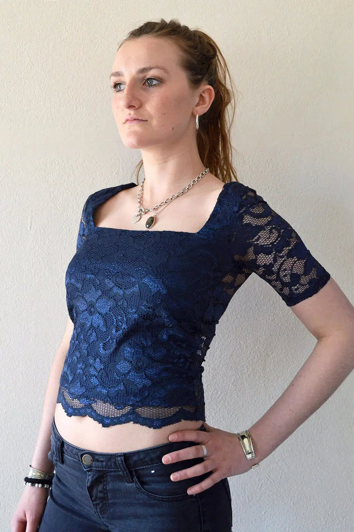 Square neckline with jersey lined front body, Hem sits on the waistline with pretty scallop edging