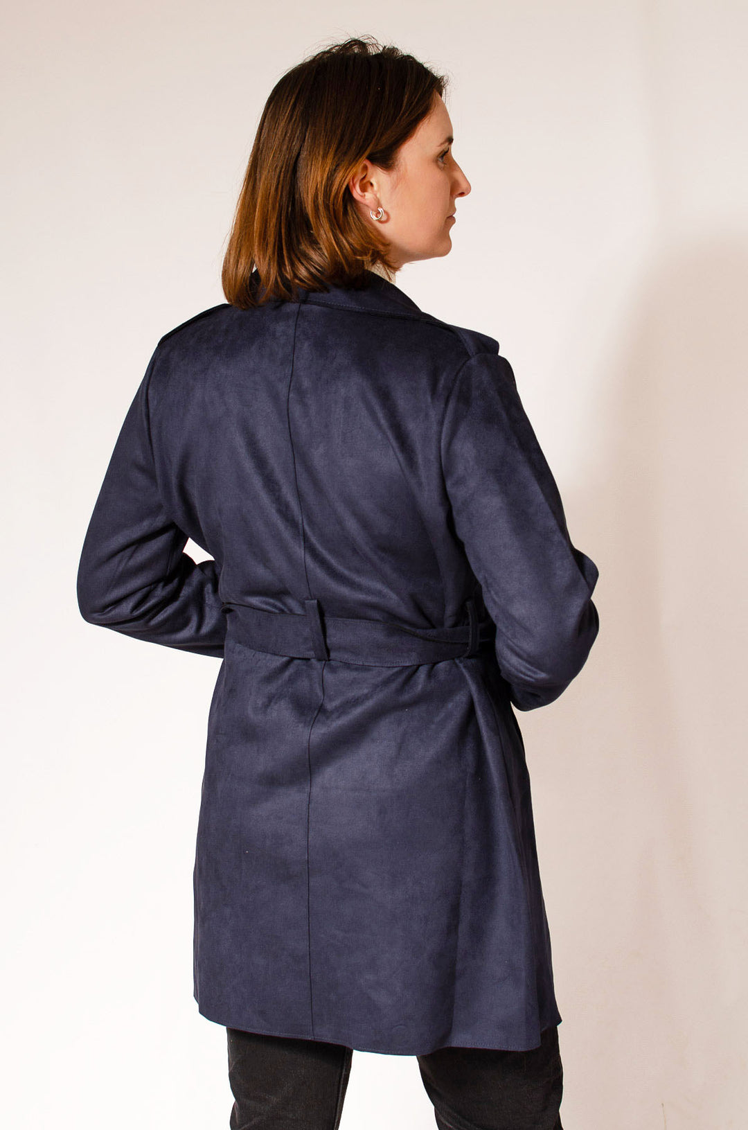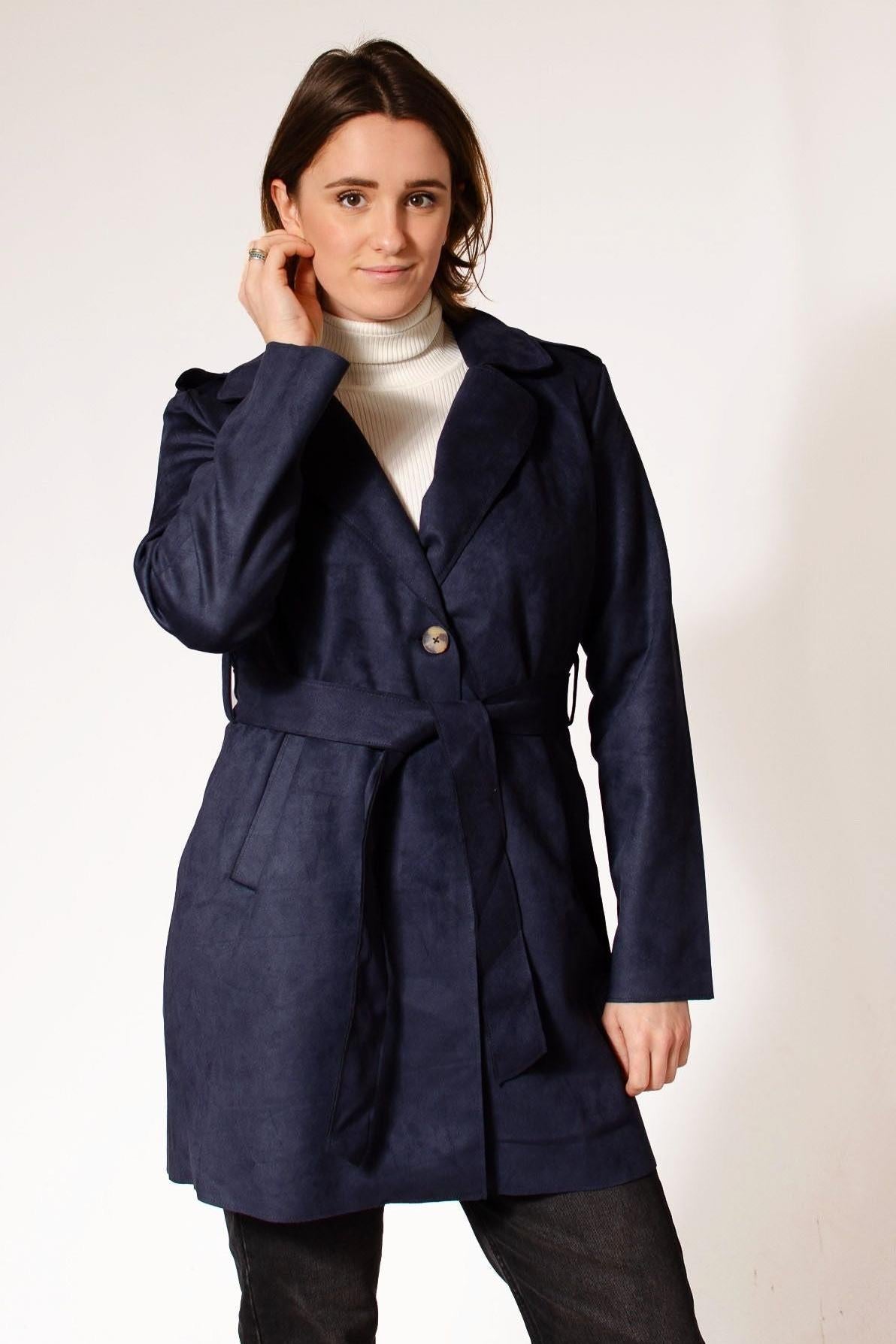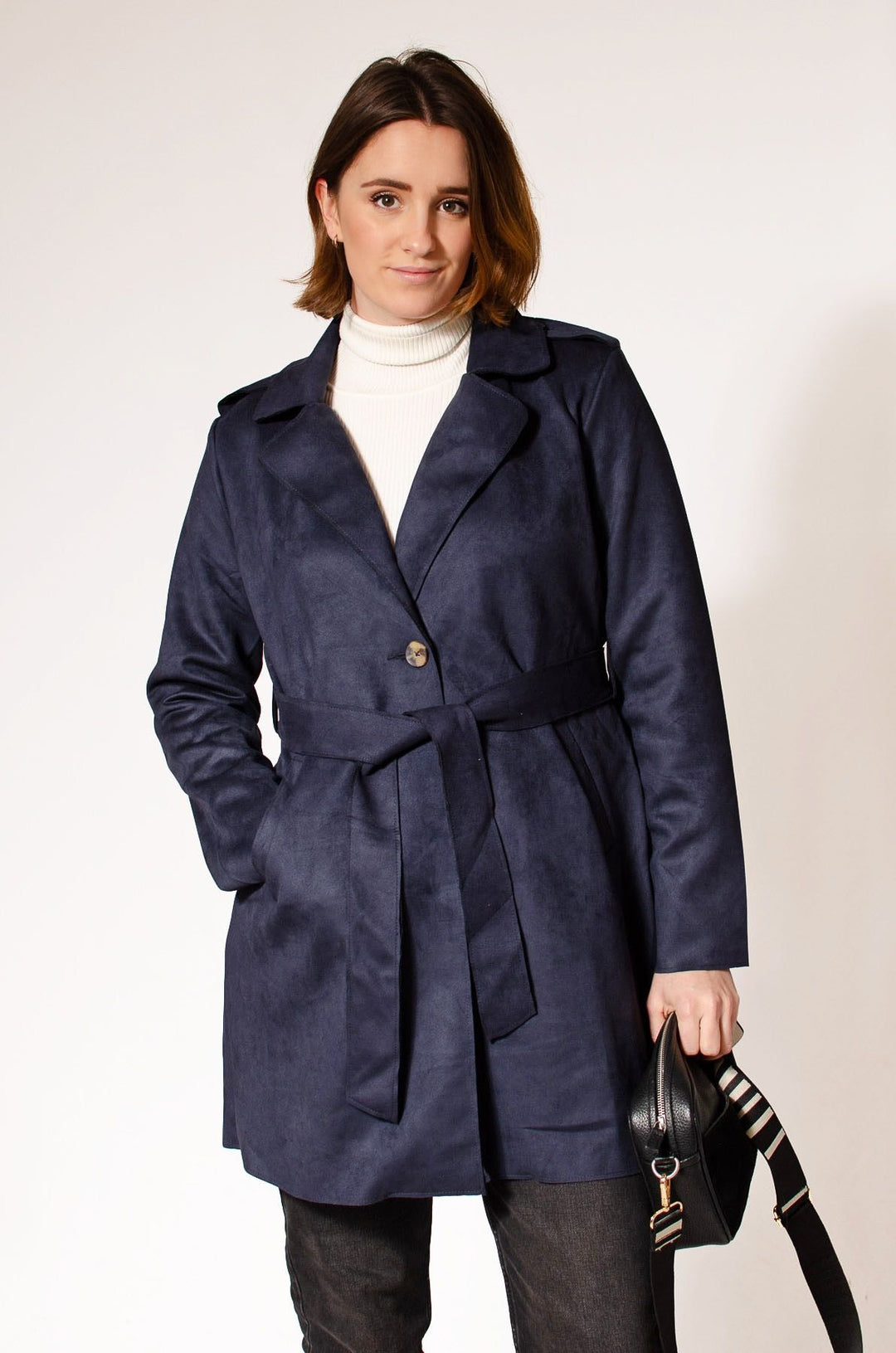 Wrap yourself in luxurious comfort with this navy blue moleskin coat. Made from soft vegan suede, cut with raw suede edges, it features a flattering tie belt and revere collar. Finished with shoulder tabs, a single button and tie belt. With two discreet front pockets, this unlined coat is perfect for a chic and effortless look.