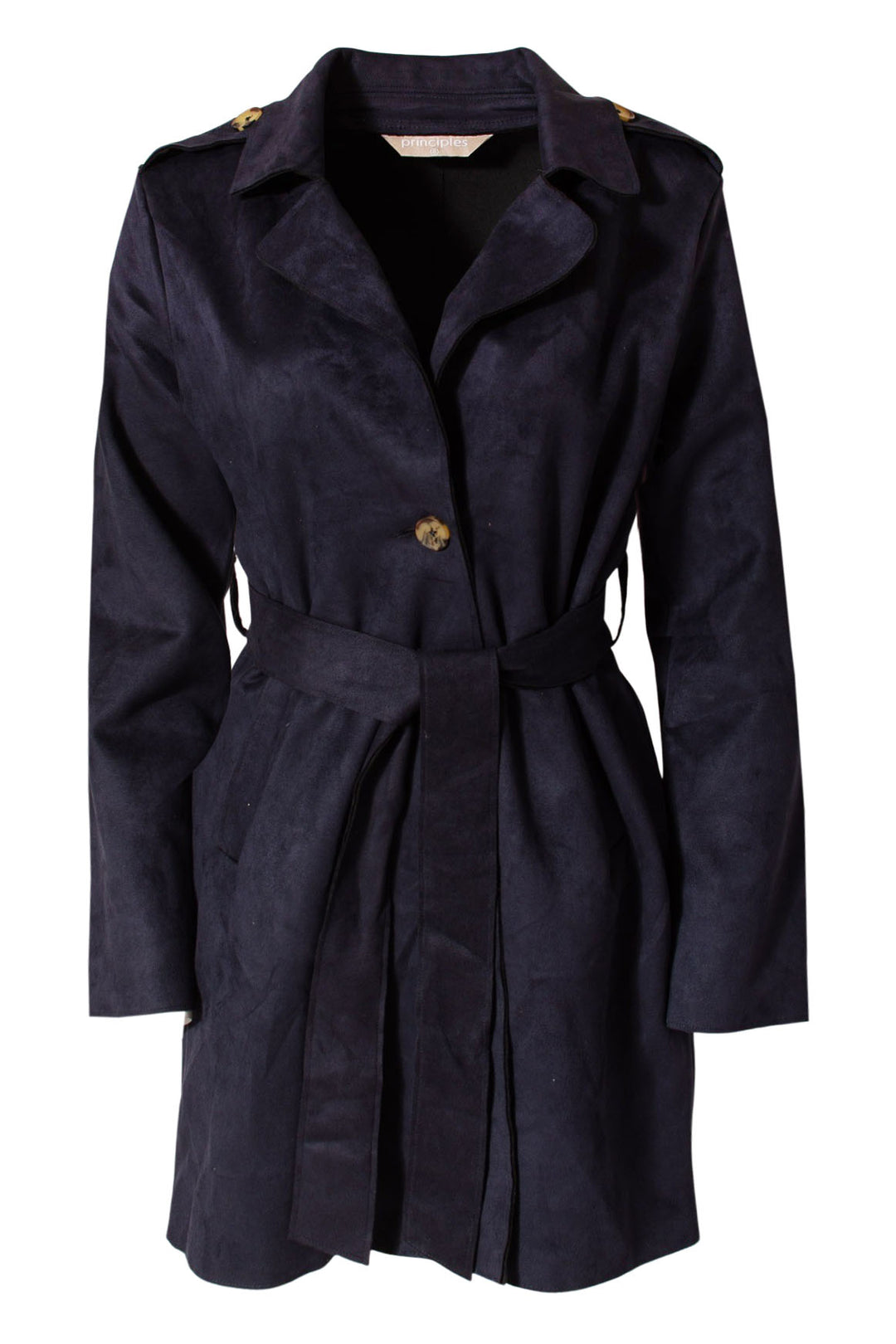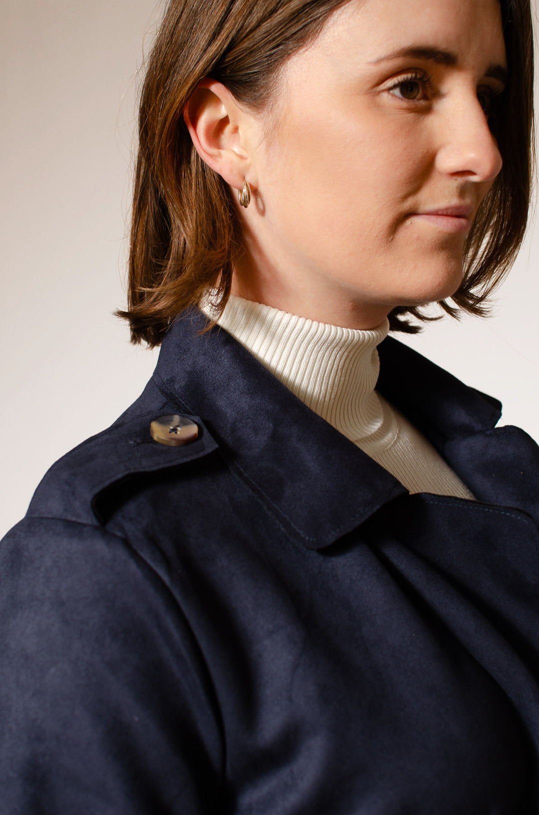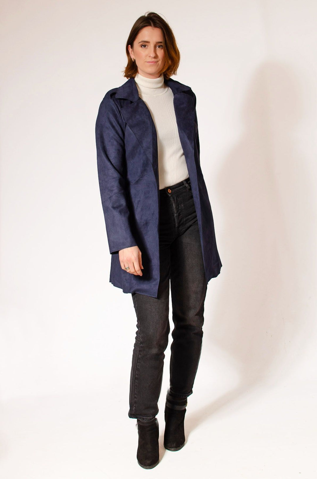 Wrap yourself in luxurious comfort with this navy blue moleskin coat. Made from soft vegan suede, cut with raw suede edges, it features a flattering tie belt and revere collar. Finished with shoulder tabs, a single button and tie belt. With two discreet front pockets, this unlined coat is perfect for a chic and effortless look.