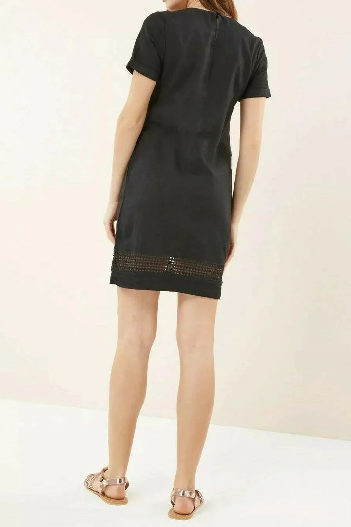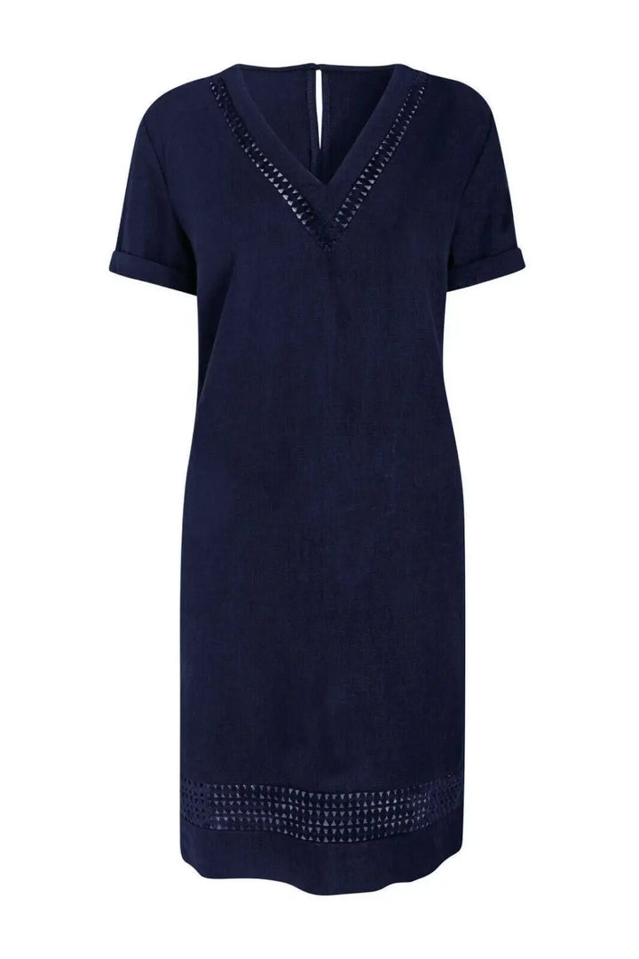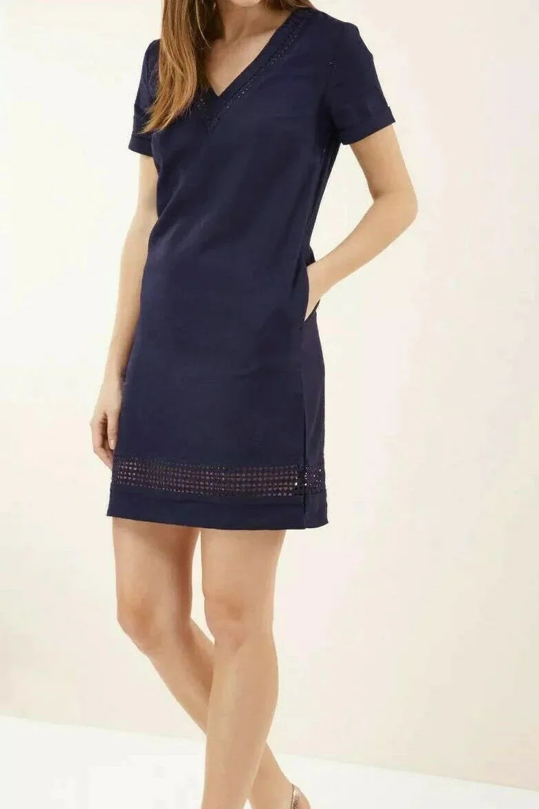 Going on holiday soon? Make sure you pack this pretty white linen-blend dress into your case. Made from a premium lightweight fabric, this warm weather staple is designed in a loose shift style to flatter any body shape. With a deep V-neck at the front, with delicate cut out embroidery detailing around the neckline and hem, finished with short sleeves and keyhole detail at the back.