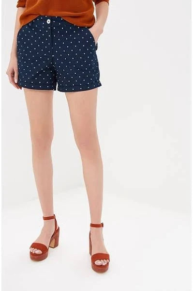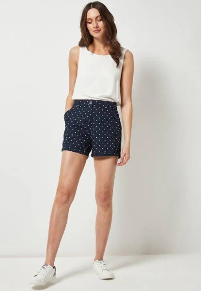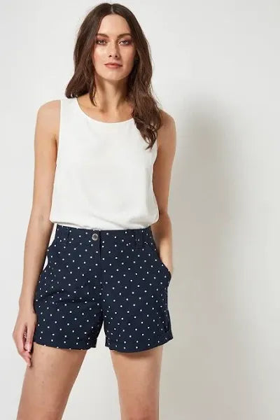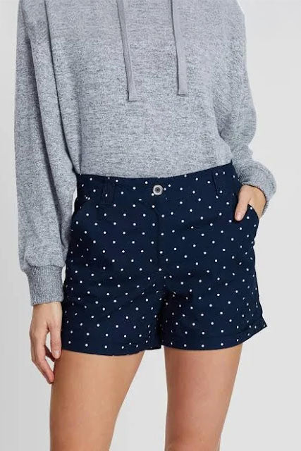 Bounce into summer with these classic navy spotted shorts. Made from breathable pure cotton, they feature convenient slant front pockets and a stylish back mock welt pocket. The roll-up hem adds a casual, customizable touch to your warm-weather wardrobe. Perfect for mixing and matching with your favourite summer tops!