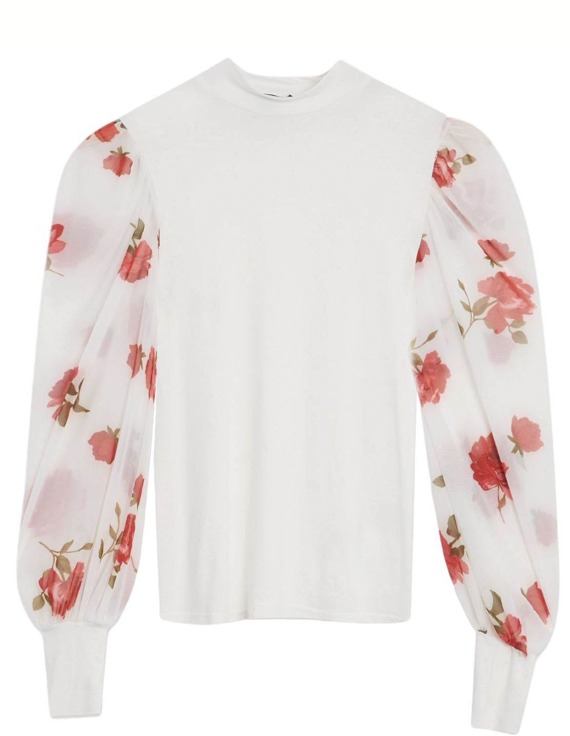 Cocktail o’clock? Go for this elegant rose print sleeve top - you can wear at work too! With a soft jersey body and high neckline in a semi fitted fit. Sheer puffed sleeves give a feminine touch with a contrasting red rose print