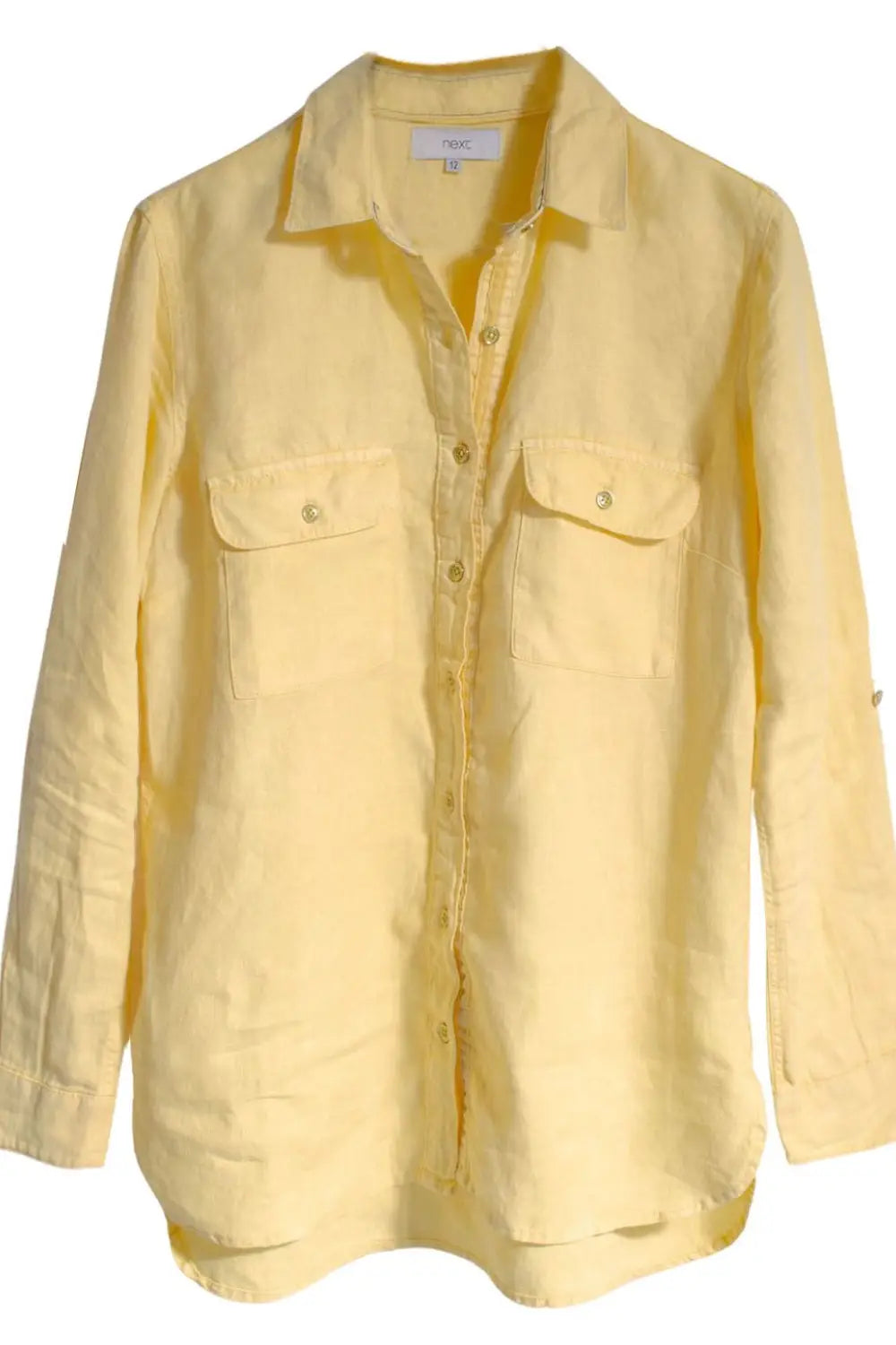 A lovely quality linen in a delicate lemon shade,can be worn with full or 3/4 length sleeves. Ideal for wearing with jeans or smart trousers.very pleased with purchase.A great price