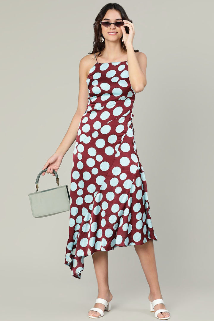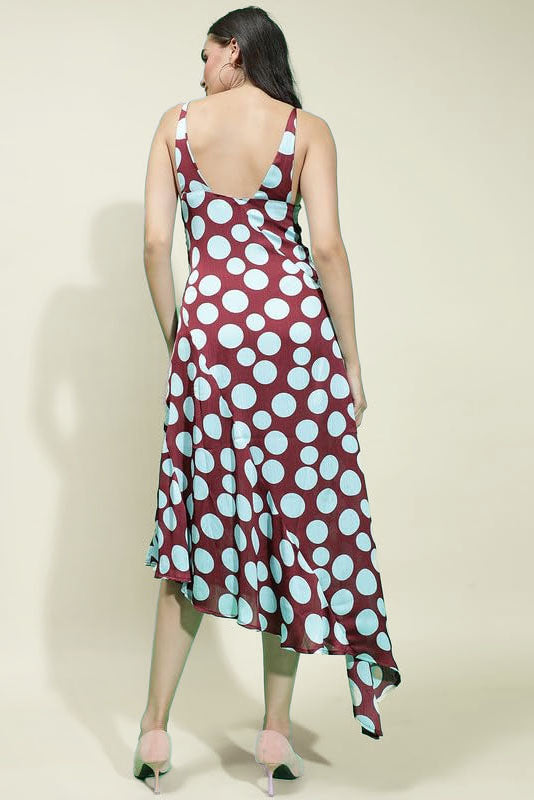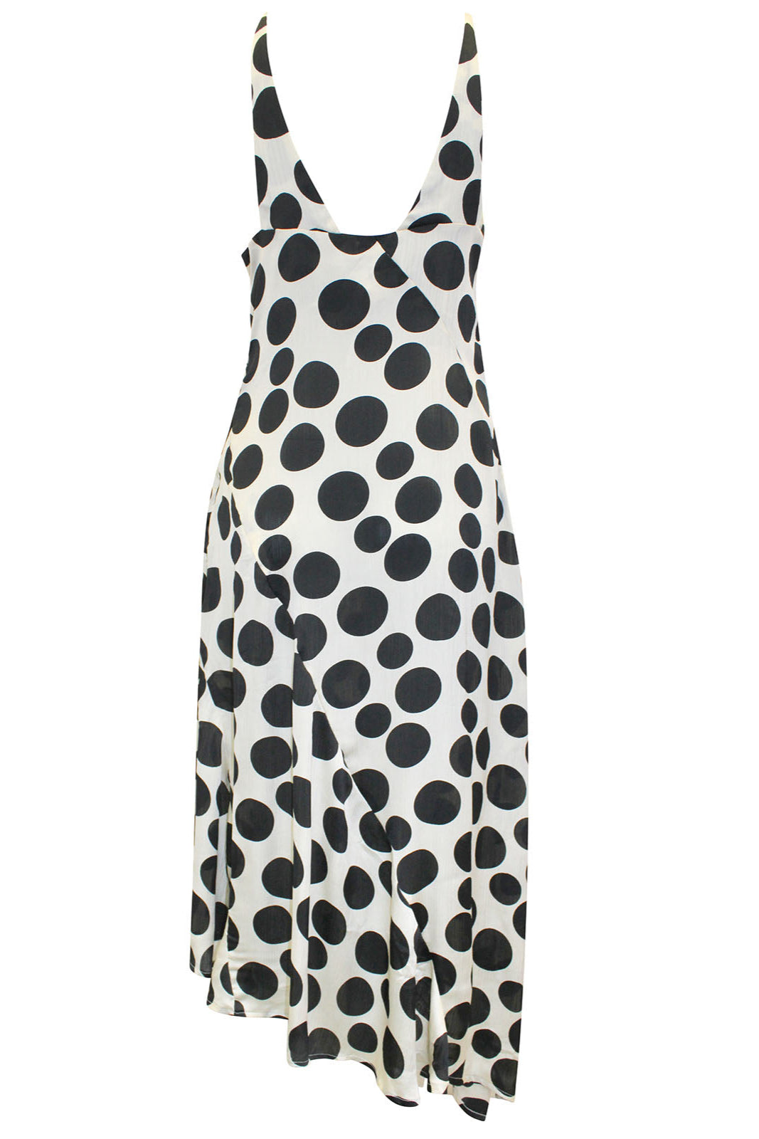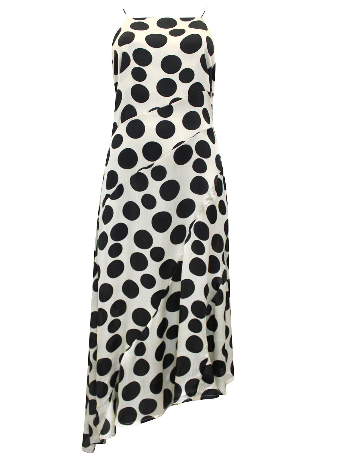 Make a statement in this eye-catching party dress from Oxololoxo. The bold spot design creates instant visual impact. Diagonal tucked seams flatter your figure. Delicate spaghetti straps and sleeveless styling offer a feminine touch perfect for warm weather. The asymmetric hemline with deep frill adds dramatic movement and elegance to this versatile piece. Turn heads wherever you go.