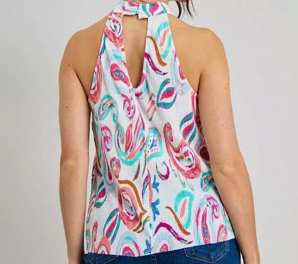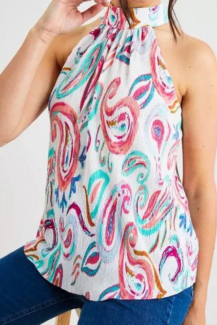 Gorgeous plisse crepe top, with button halterneck. Floaty relaxed fit, makes for a lovely flattering top - for any occasion. Pair with pale jeans and heels for evening look, or jeans and sneakers for a more relaxed look.