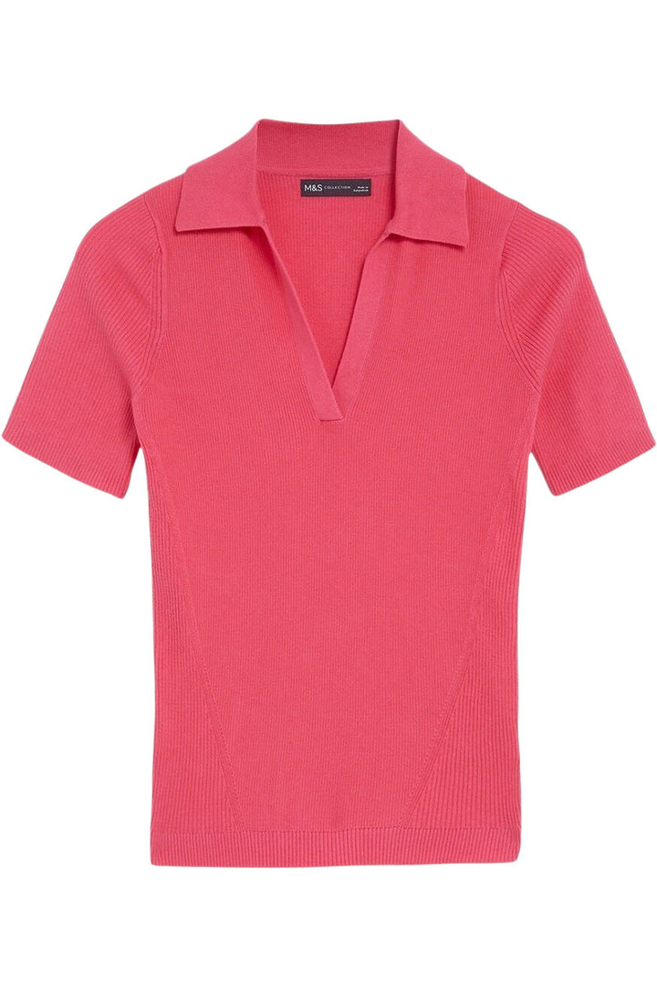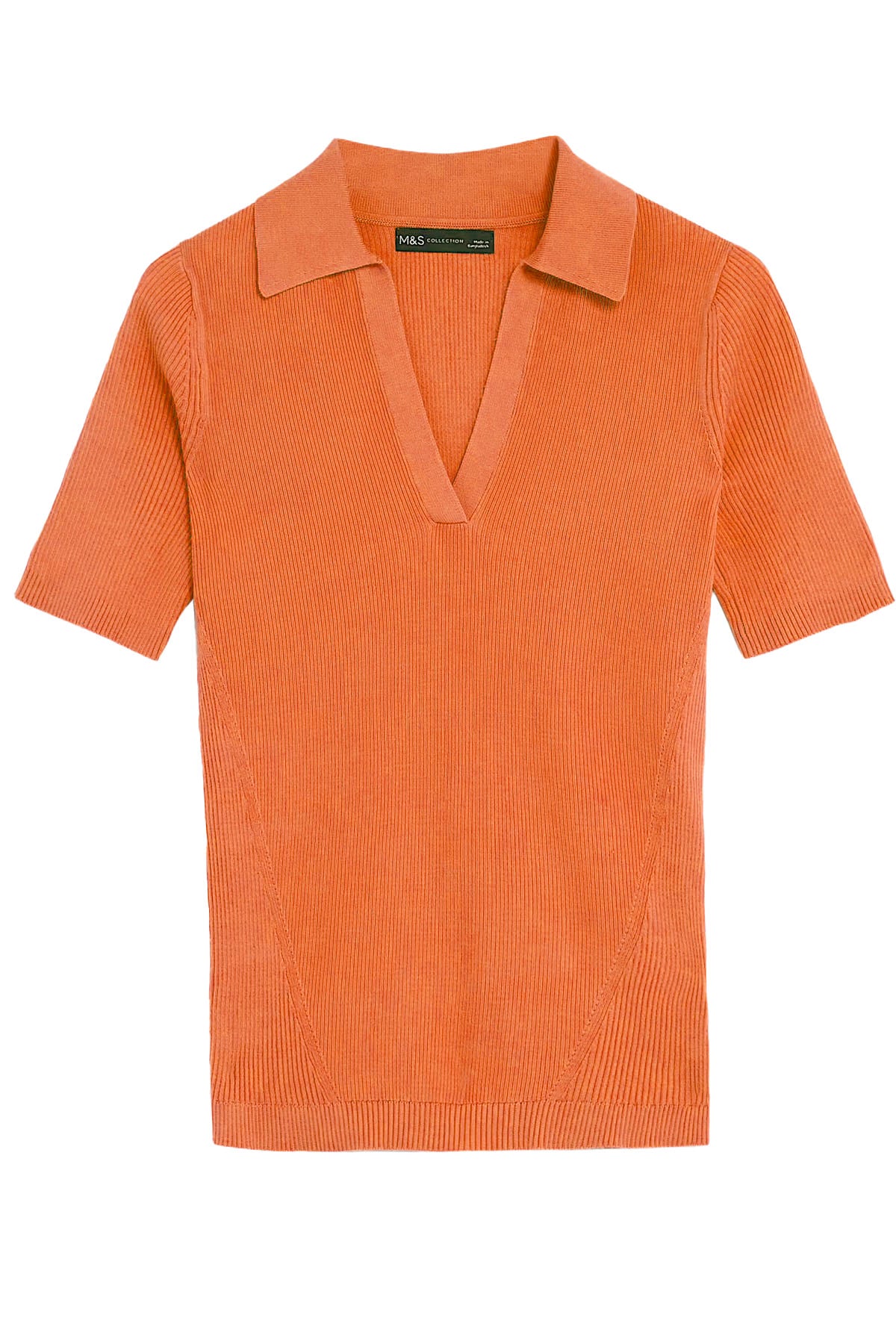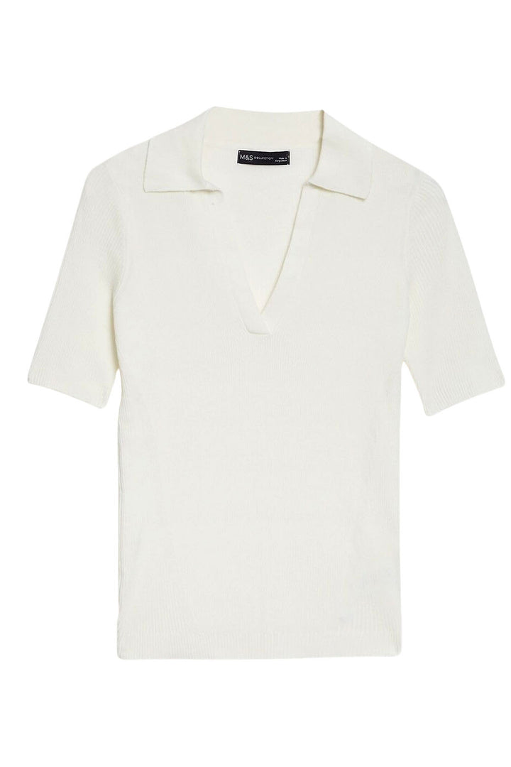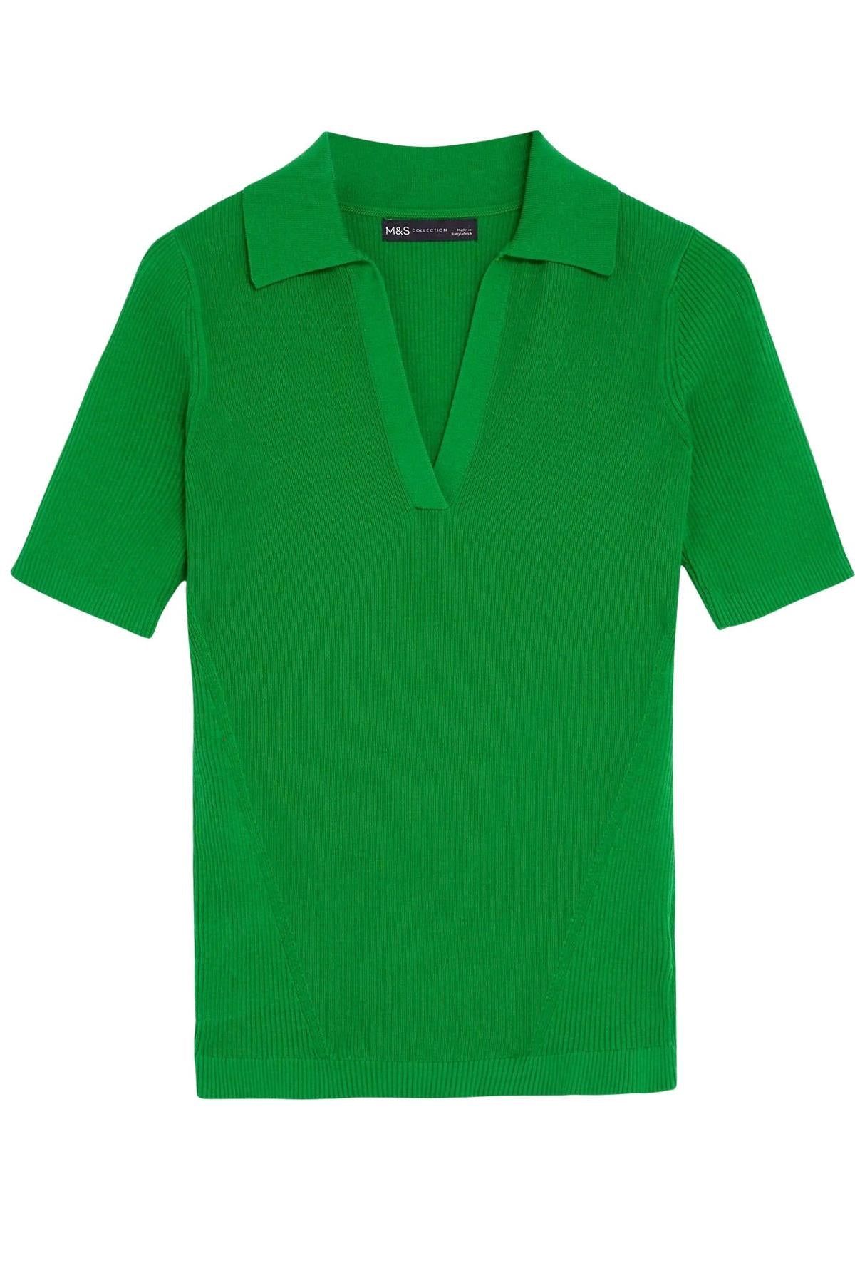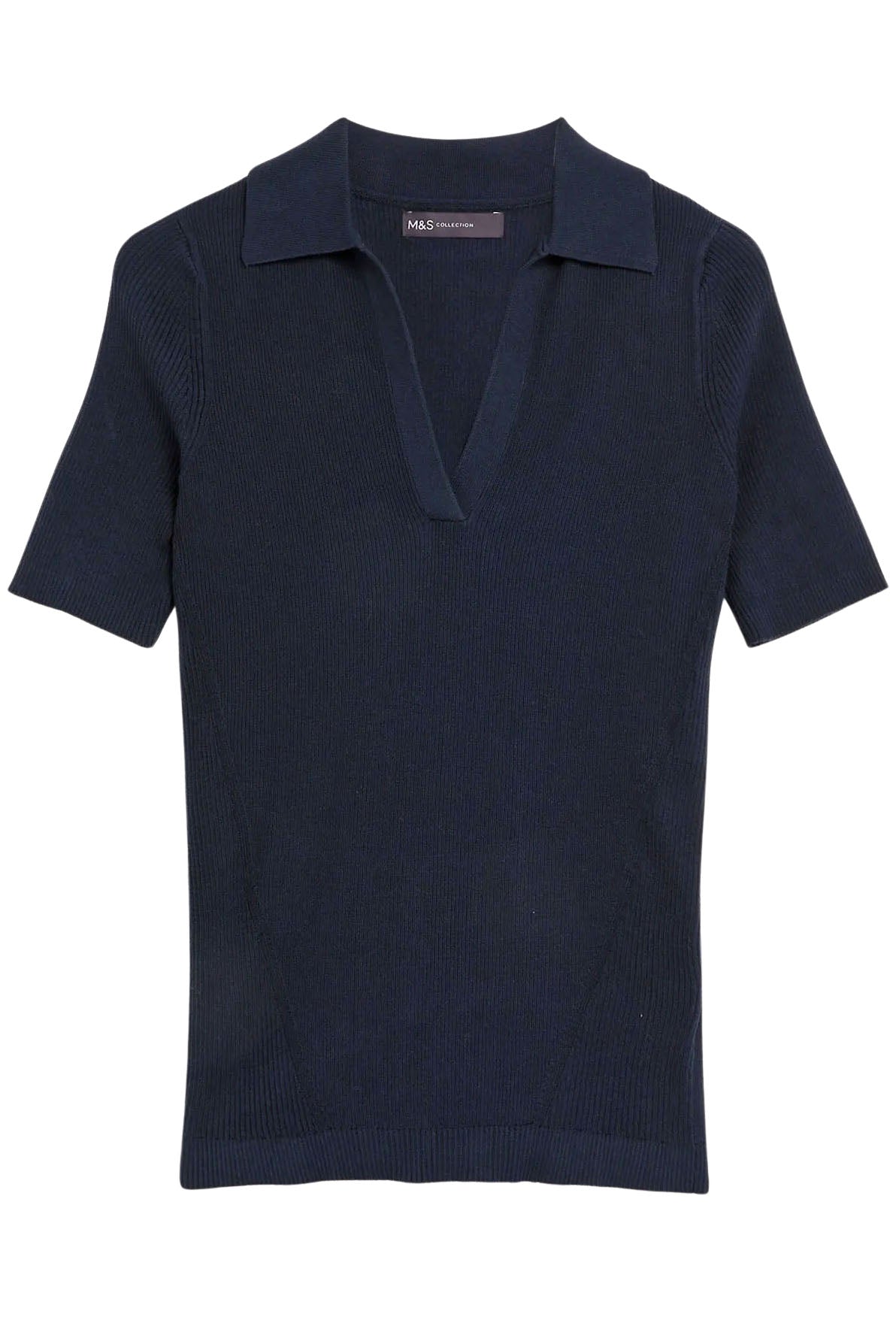 Inspired by the classic polo shirt, this cotton-rich knitted top has a v-neck and an open collar. It's cut to a regular fit, with neat short sleeves. A subtle ribbed texture provides natural stretch and adds character