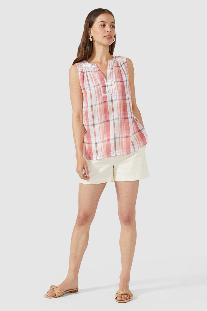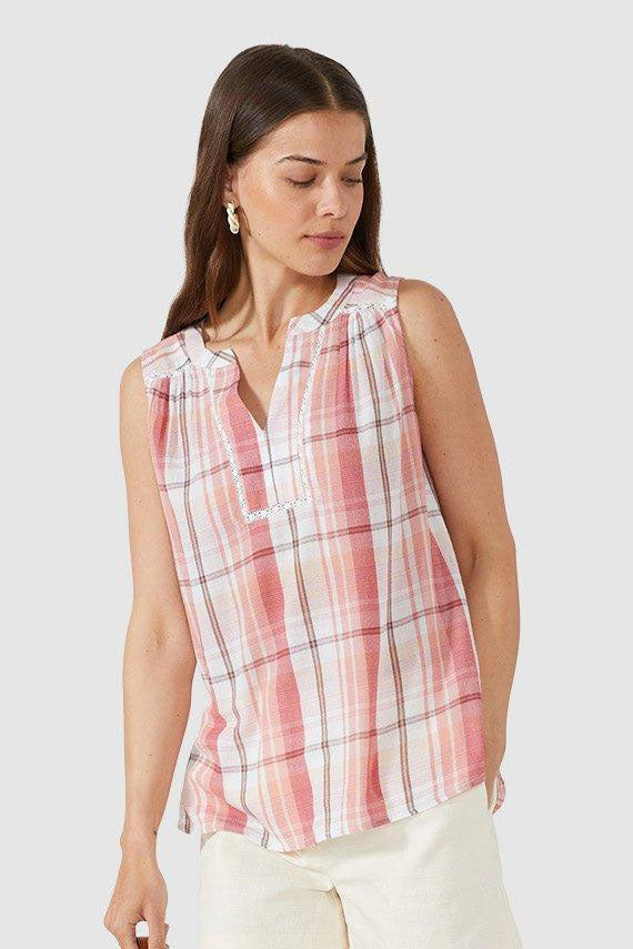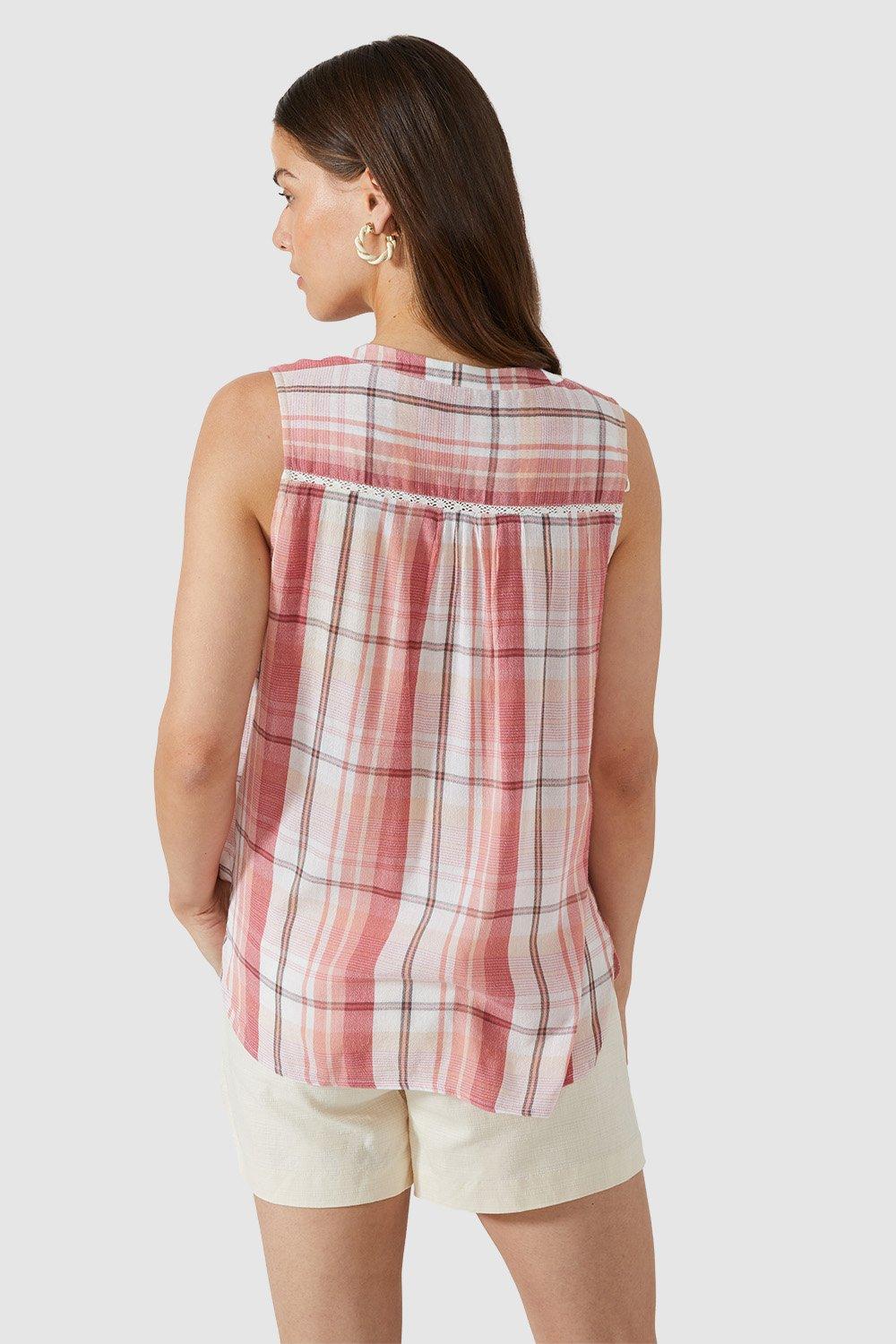 Pink Check Sleeveless Notch Neck Top