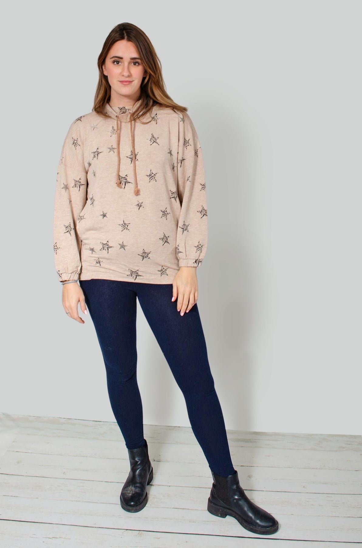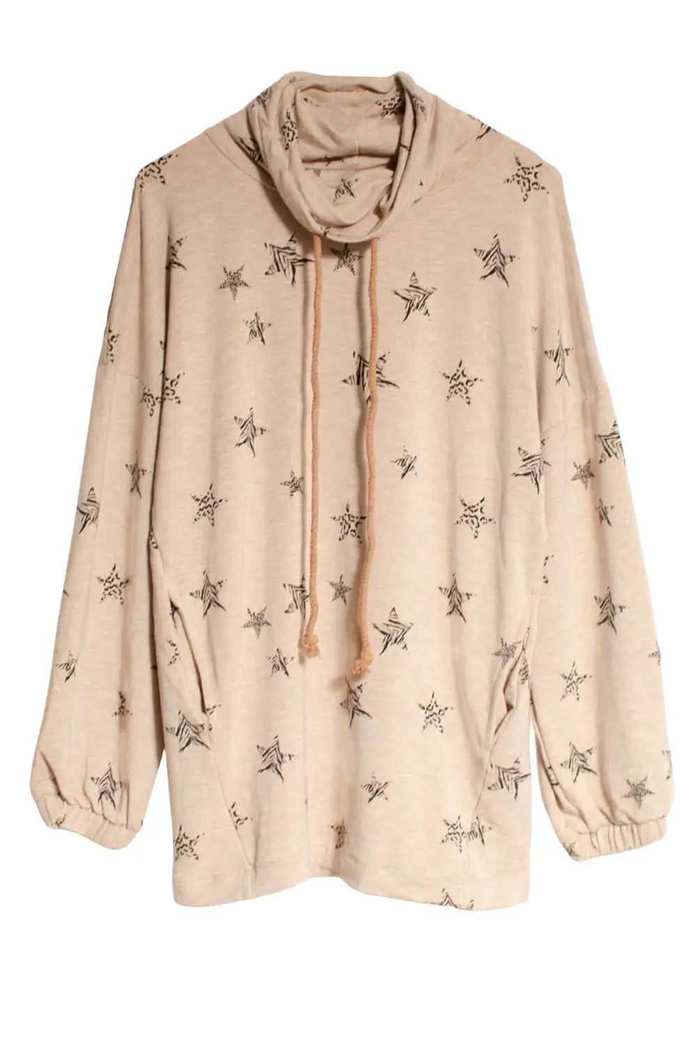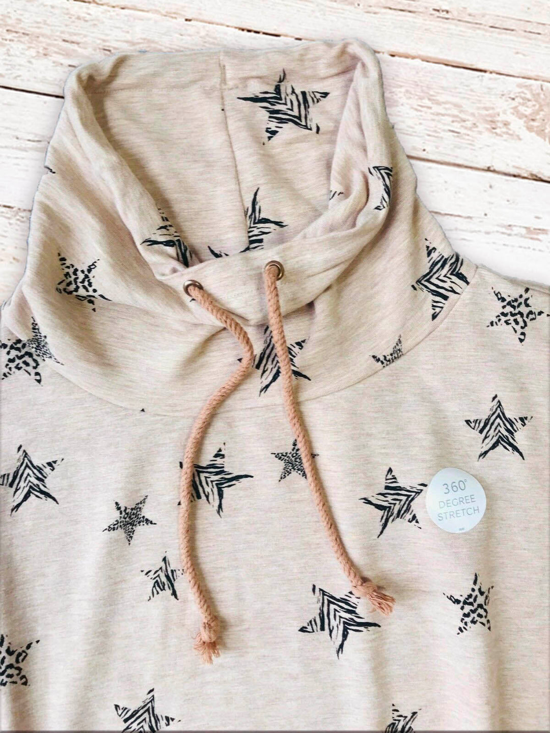 This soft top will be the star of your loungewear collection. Long sleeves and a slouchy funnel neck to keep you cosy, with adjustable drawstrings to keep the chill out. Allover starry pattern. Made with Flexifit technology so it will stretch and move with your body for ultimate comfort. The kangaroo pocket keeps all your lounging essentials at hand.