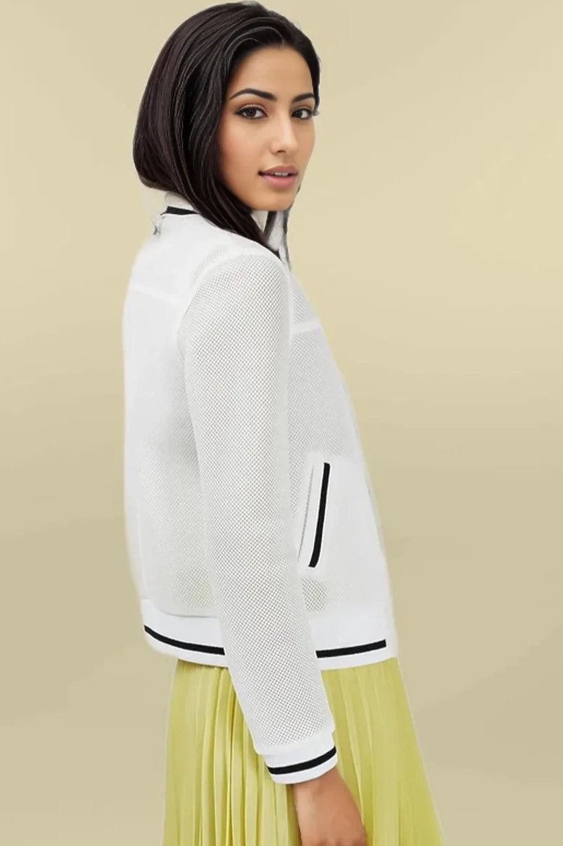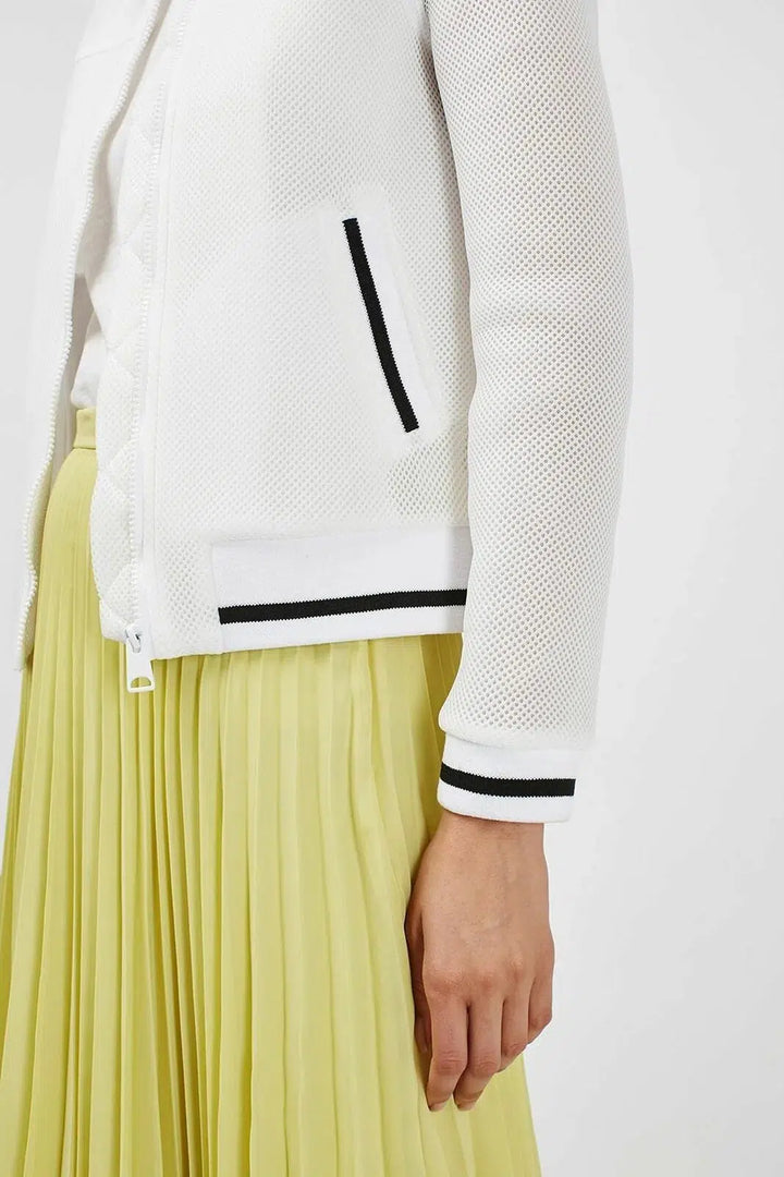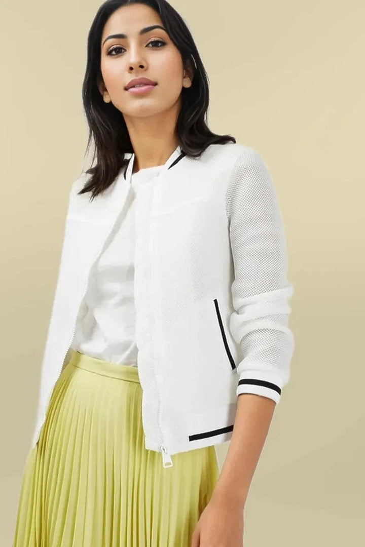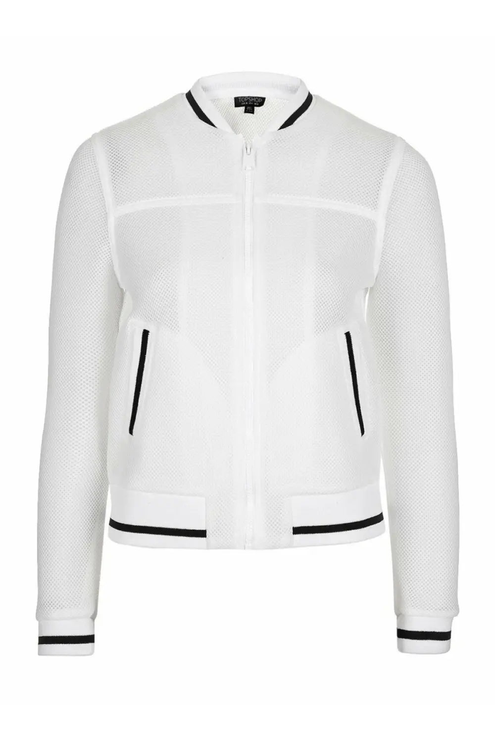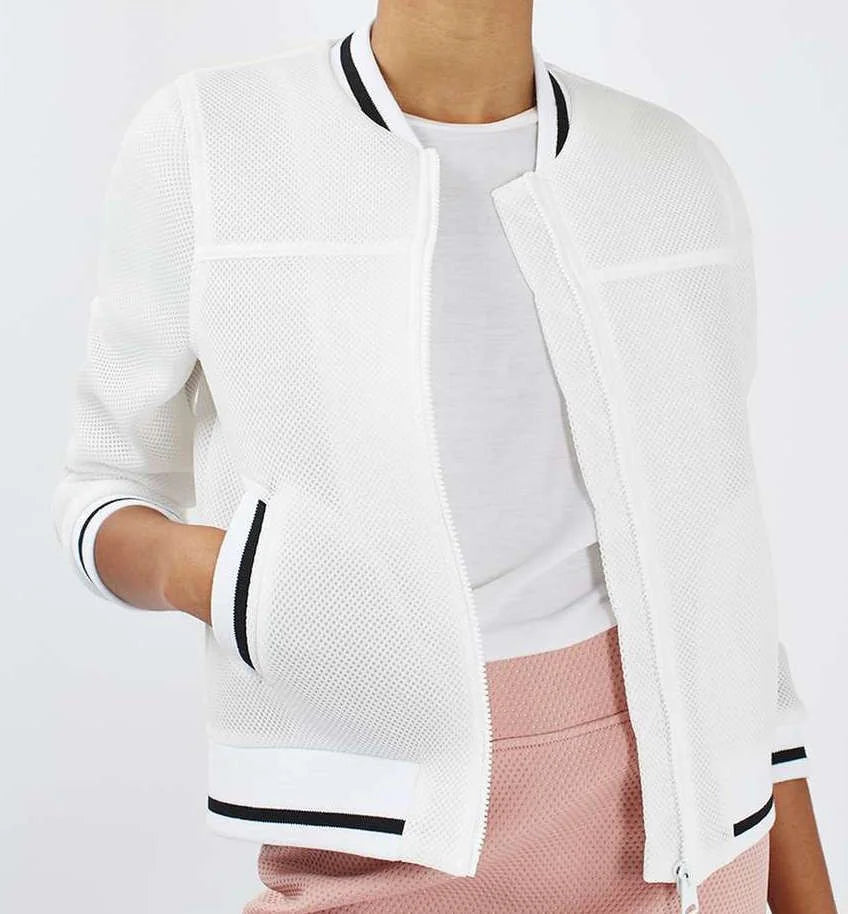 Add some sporty styling to your look with this airtex bomber jacket, featuring a navy contrast stripe rib. Style with your jeans for a classic look or your favourite skirt and some crisp white trainers for a more feminine look.