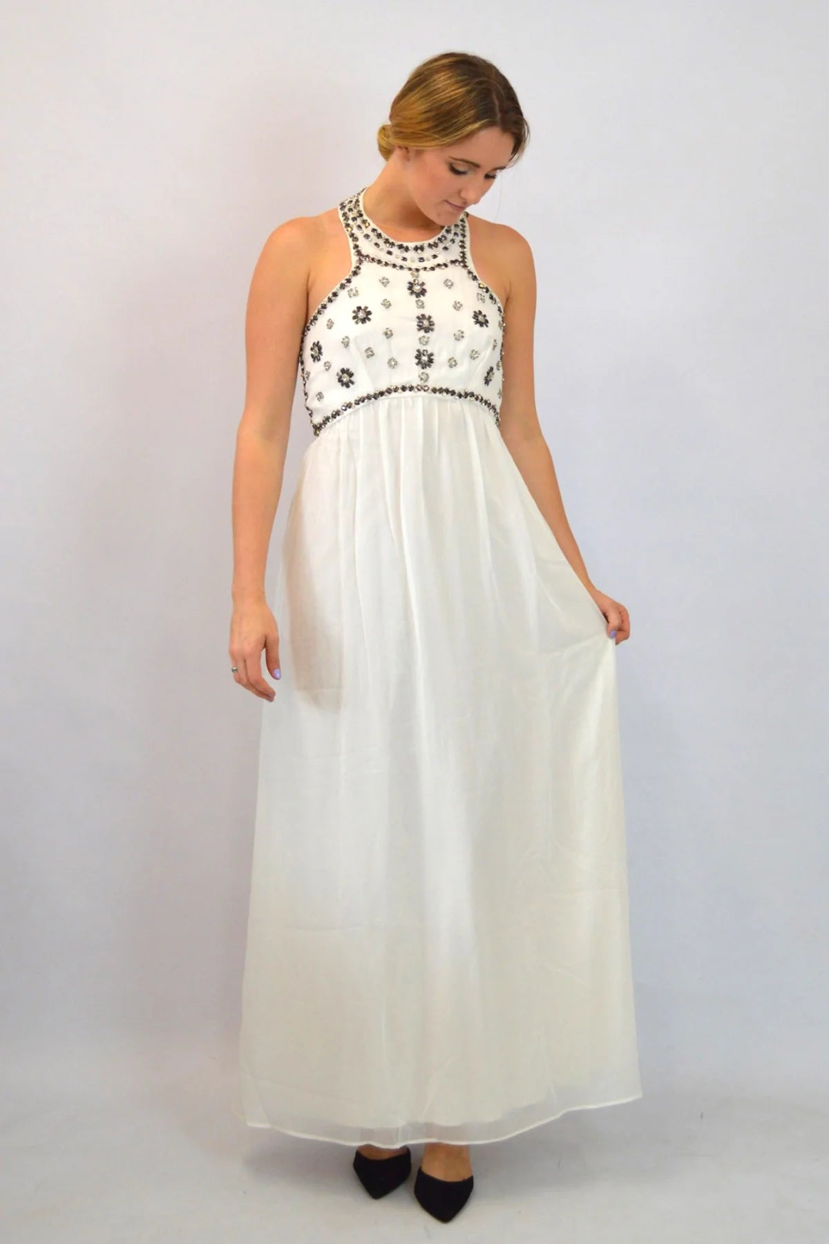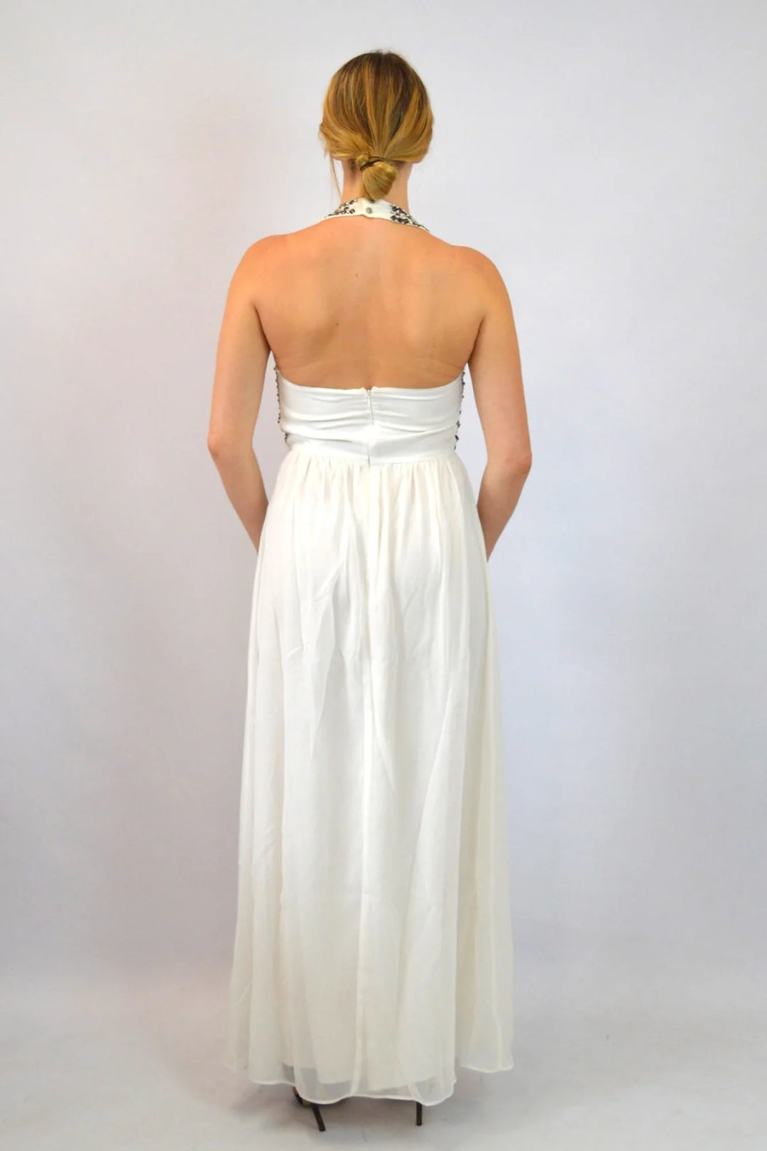 The most stunning dress with beaded bodice, Hand beaded diamante detail to bodice, chiffon layered over lining. Elegant Halterneck Design, Fully Lined Chiffon