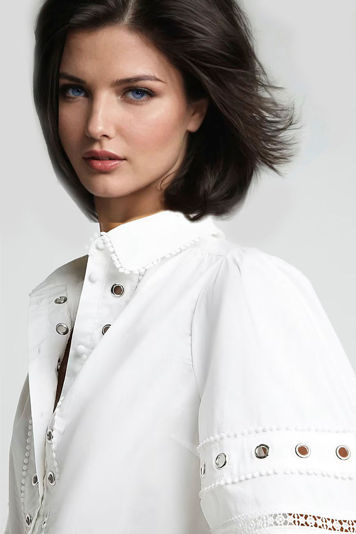 The one you can wear anywhere, with anything, in any season. This boho gypsy shirt features striking silver eyelet detailing with an ibiza vibe. Cut with an open neck collar finished with long puffed sleeves, the cuffs add a touch of sophistication.